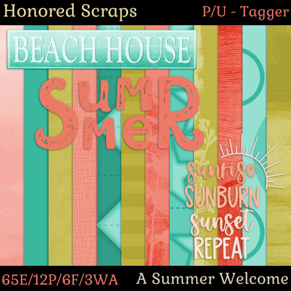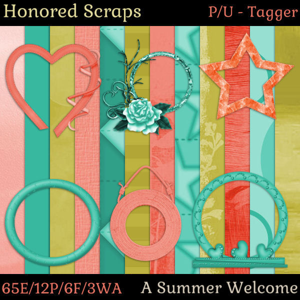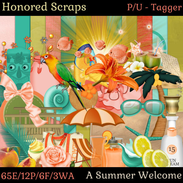 A Summer Welcome is a tagger kit that consists of 65 elements, 12 papers, 6 frames and 3 word art.