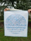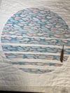 This wall quilt has a peaceful, modern design with soft pastel shades of blue, pink, and white. The center features overlapping shapes that feel calm and flowing, like water or sky reflections. It's framed by a delicate patterned border that matches the soft colors. Simple horizontal stitching adds texture and structure, giving it a clean, minimal look. Perfect for adding a subtle artistic touch, this quilt is a great fit for modern or contemporary spaces.