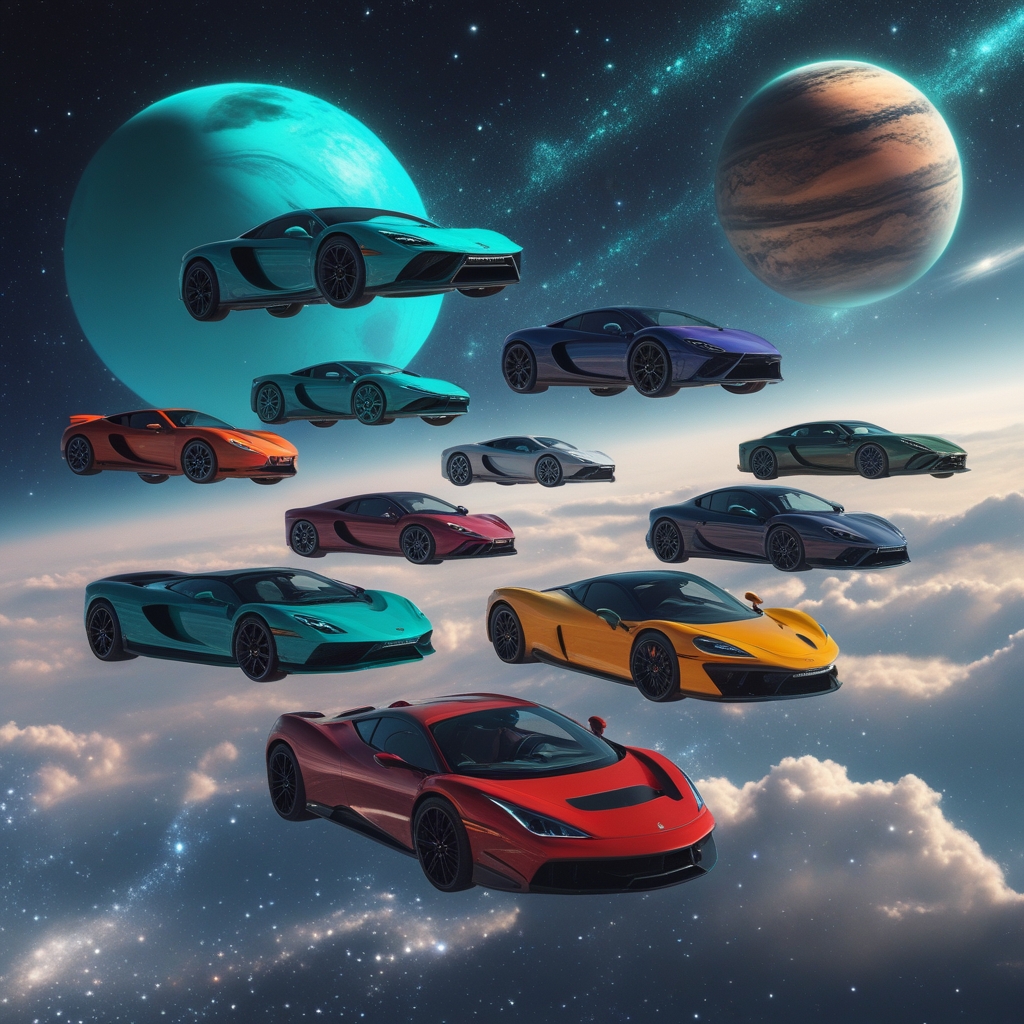 Depict a breathtaking, surreal scene with a diverse array of sleek, high-performance supercars, each uniquely designed and colored, suspended in mid-air amidst the vastness of space, surrounded by a vibrant, starry night sky, with two celestial bodies - a distant, glowing, turquoise-hued gas giant and a smaller, rocky, earth-toned planet - floating in the background, with subtle, shimmering stardust and nebulae adding depth and texture to the cosmos, and a soft, ethereal glow emanating from the planets, casting an otherworldly light on the supercars, which appear polished and reflective, showcasing their intricate details and aerodynamic curves.