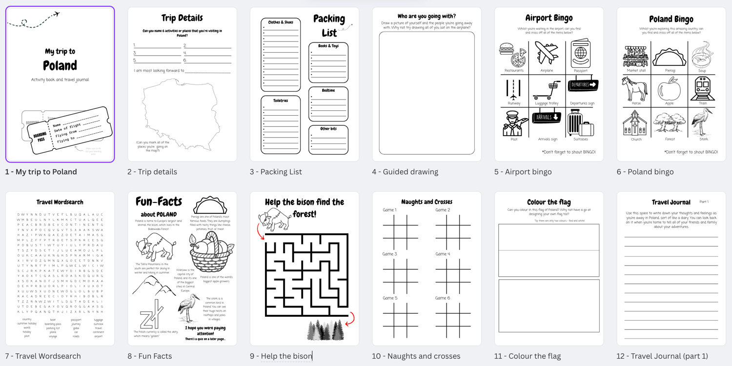 "My Trip to Poland" isn’t just for fun – it’s packed with helpful tools too! There’s space to fill out their own itinerary, a kid-friendly packing checklist, flight-friendly games, and even airport bingo – helping children feel prepared, excited, and involved in the journey.