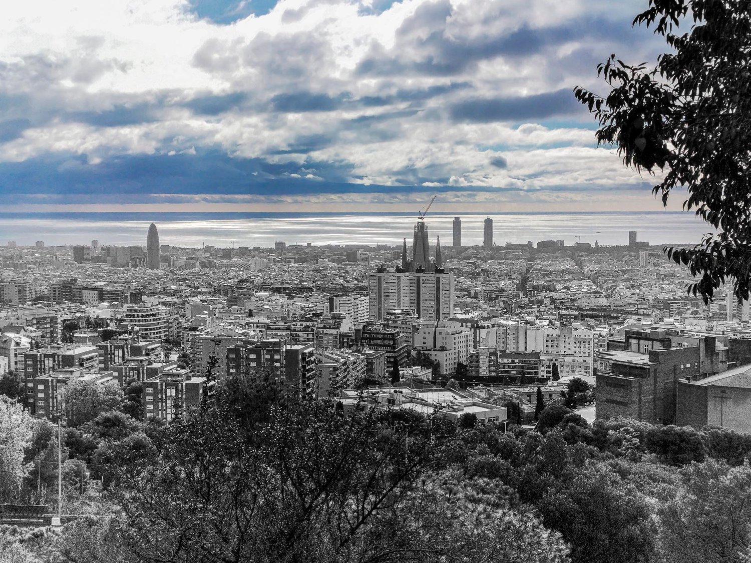 The sprawling cityscape stretches towards the horizon, with a backdrop of dramatic clouds and the sea beyond. Tall buildings, including a distinctive skyscraper, punctuate the skyline, while leafy trees frame the scene in the foreground.