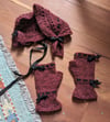 This pattern includes both an ‘under the bonnet’ cap (yarn held double) AND period inspired muffatees (yarn held single) with bows.