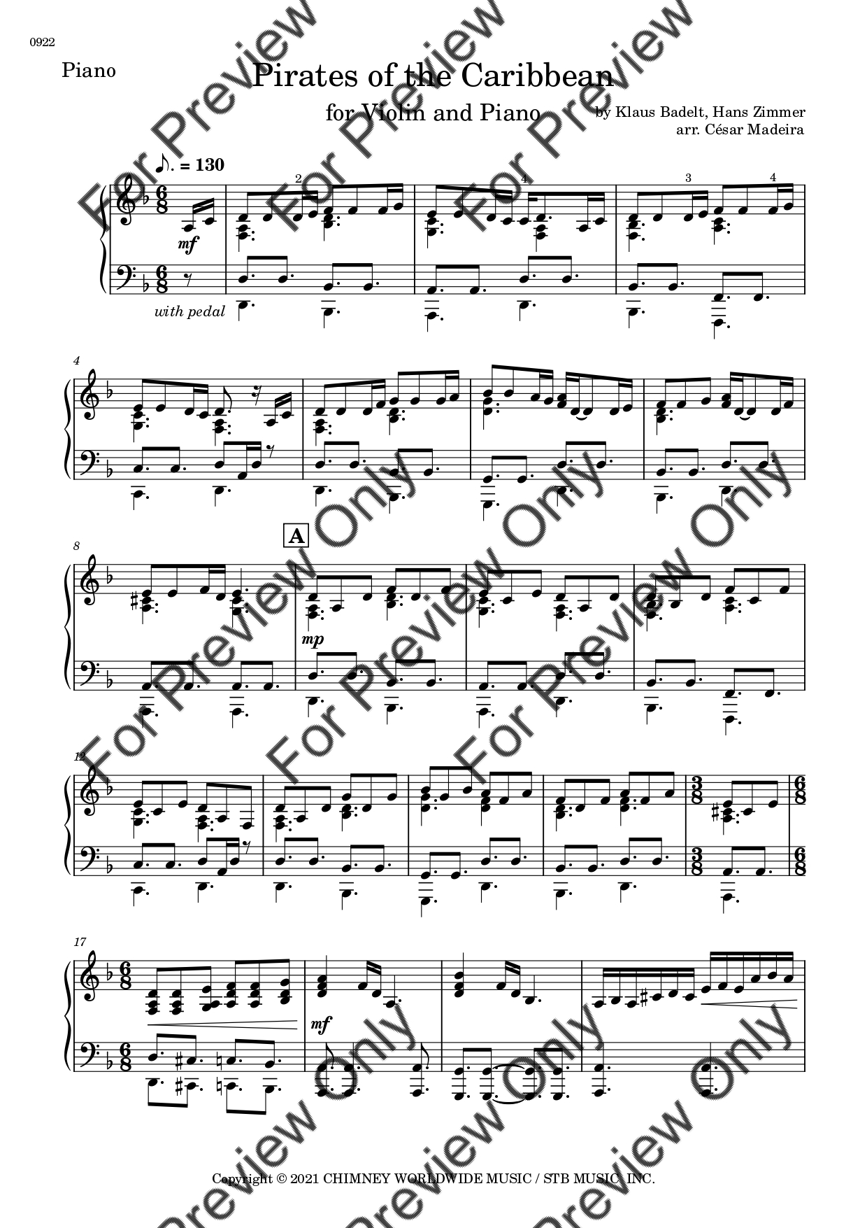 Pirates Of The Caribbean by Hans Zimmer. Arrangement for Violin and Piano. With Full Score and Individual Parts. Have fun!