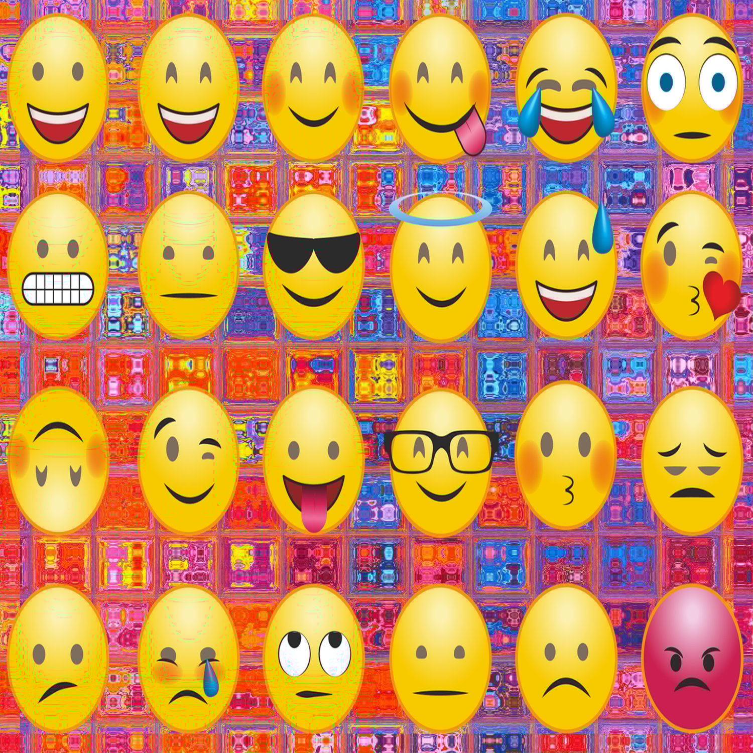 A set of 3, 12" x 12" digital download designs of an abstract design featuring a board of assorted emojis, on a multicolour tile effect background, designed to look good displayed on any wall. All 3 designs are contained in just 1 ZIP file, for ease of download, and are available immediately after purchase. They come ready to print out and hang, and also framed should you so wish.These prints are the perfect way to provide colour in your life! Get yours today!