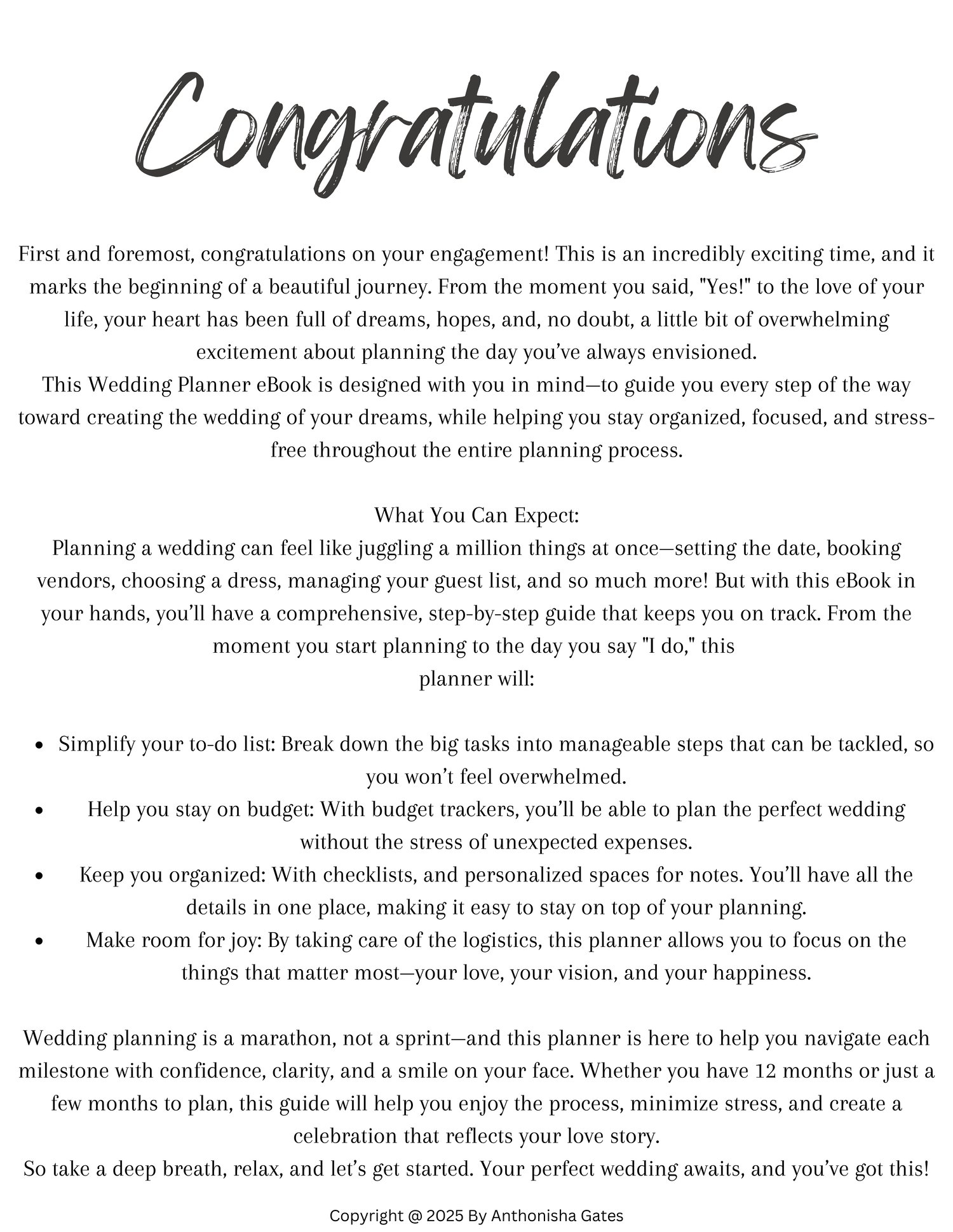 Planning your wedding just got easier! This beautifully designed wedding planner helps you stay organized, on budget, and stress-free as you plan your big day. With sections for budgeting, guest lists, vendor contacts, checklists, and more, this planner is your go-to guide from “Yes!” to “I do.”