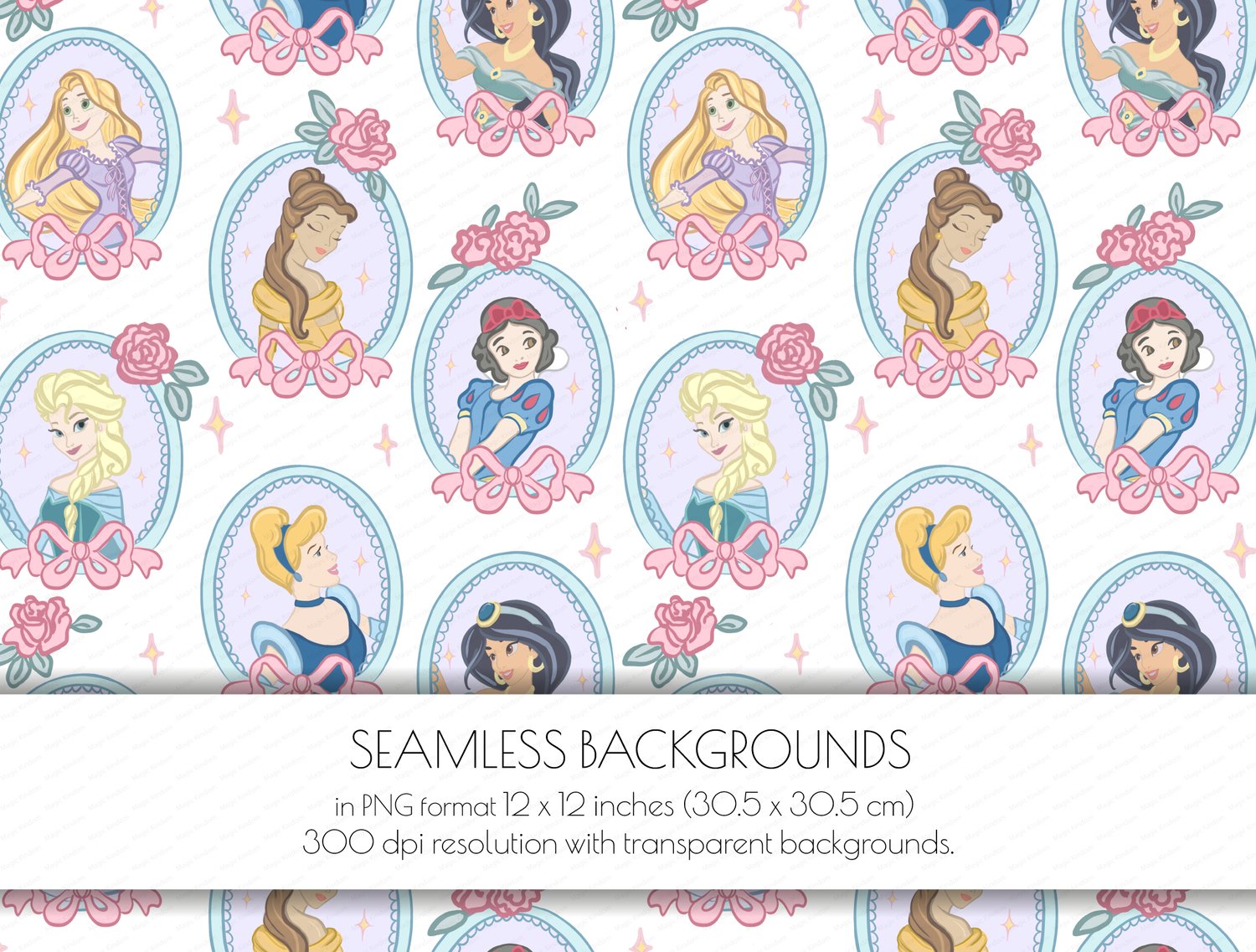 1 Princesses digital paper,Cinderella, Tiana, jasmine, Rapunzel, Seamlessbackground in PNG format 12 x 12 inches (30.5 x 30.5 cm) 300 dpi resolution .