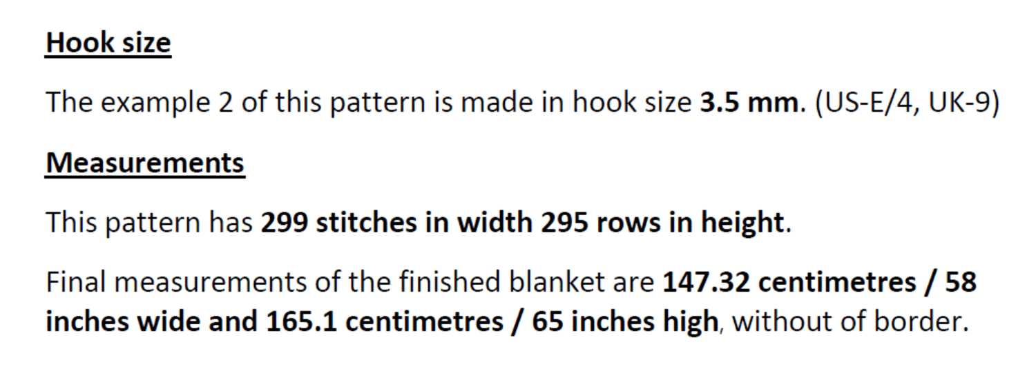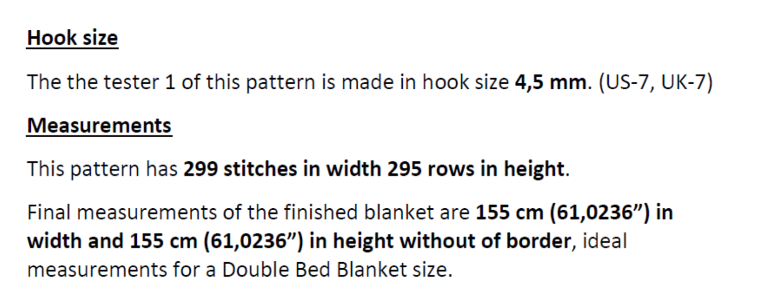 For this pattern, my tester Monique van der Veeken used a 4,5 mm hook (US = 7, UK = 7) and the measurements with the recommended yarn (Zeeman Royal) were 155 cm (61,0236”) in width and 155 cm (61,0236”) in height without of border, ideal measurements for a Double Bed Blanket size.