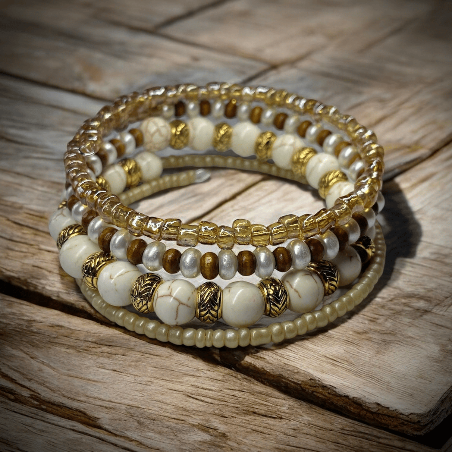 Elevate your everyday style with this beautifully coordinated layered beaded bracelet set, designed to blend natural textures with timeless elegance. Featuring creamy ivory-toned stone beads, warm wood accents, soft pearl-like beads, and gleaming gold-tone spacers, this bracelet creates a rich, earthy palette with a touch of luxury.