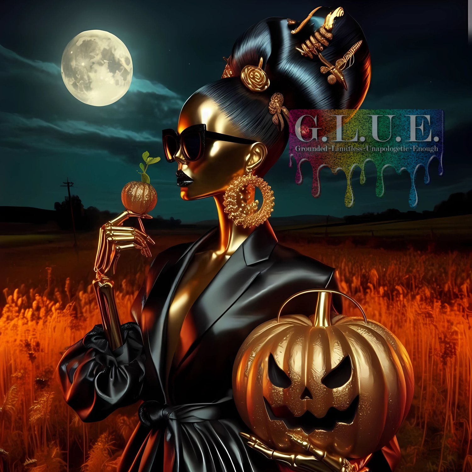 A vision in black silk and gold — this pumpkin queen glows with Afrofuturistic elegance, bringing luxury to Halloween decor.