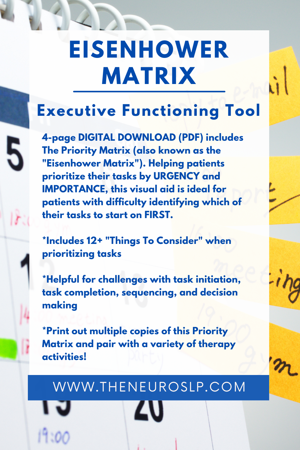 4-page DIGITAL DOWNLOAD (PDF) includes The Priority Matrix (also known as the "Eisenhower Matrix"). Helping patients prioritize their tasks by URGENCY and IMPORTANCE, this visual aid is ideal for patients with difficulty identifying which of their tasks to start on FIRST.