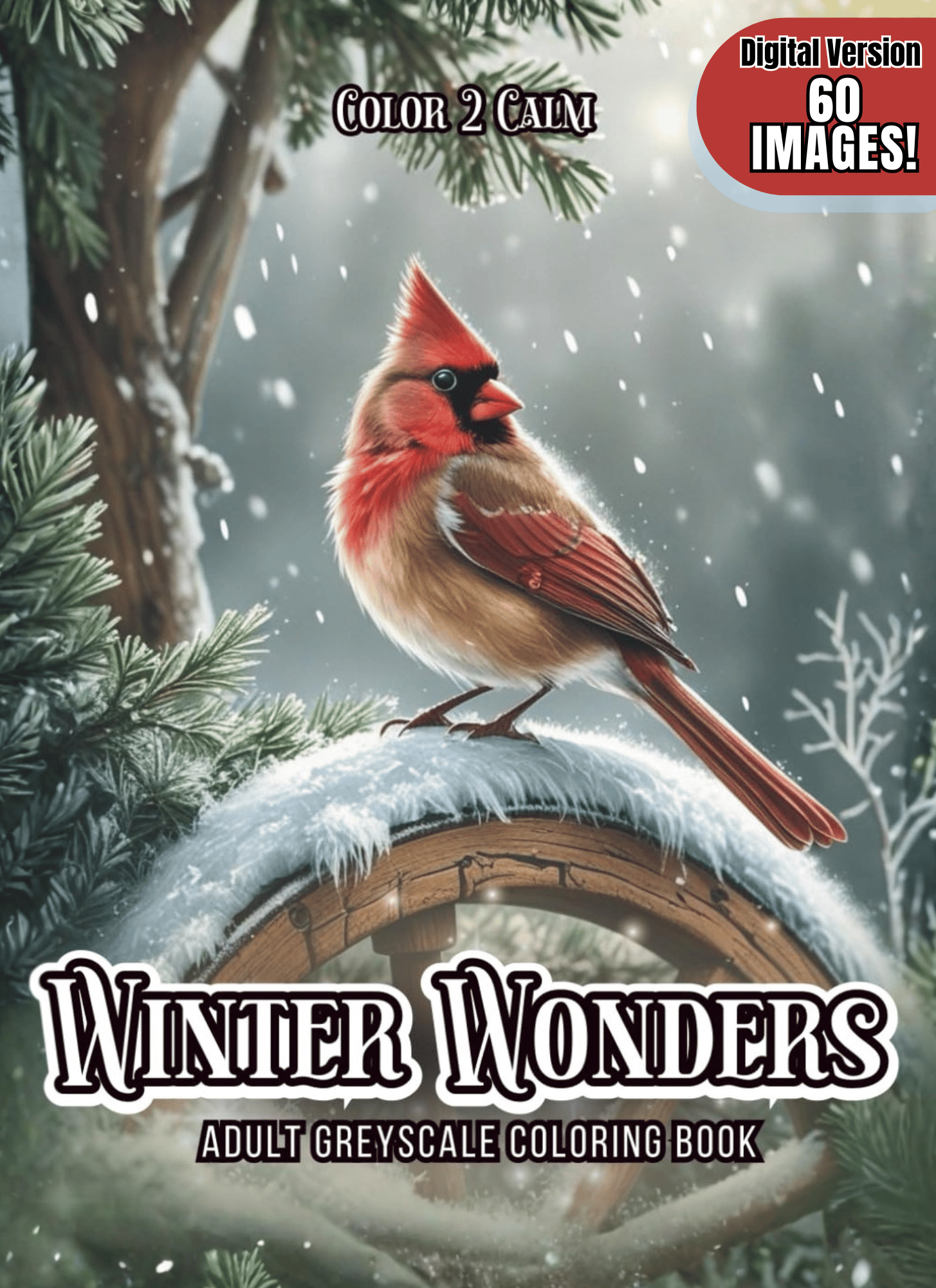 "Winter Wonders Greyscale Adult Coloring Book" is a cozy coloring adventure that is sure to keep you warm in the chilly months! Over 60 breathtaking greyscale images including Winter Scenes, Frosted Windowpanes, Cozy Porch Swings, Glowing Lanterns and Snowy Woodland Birds & Animals.