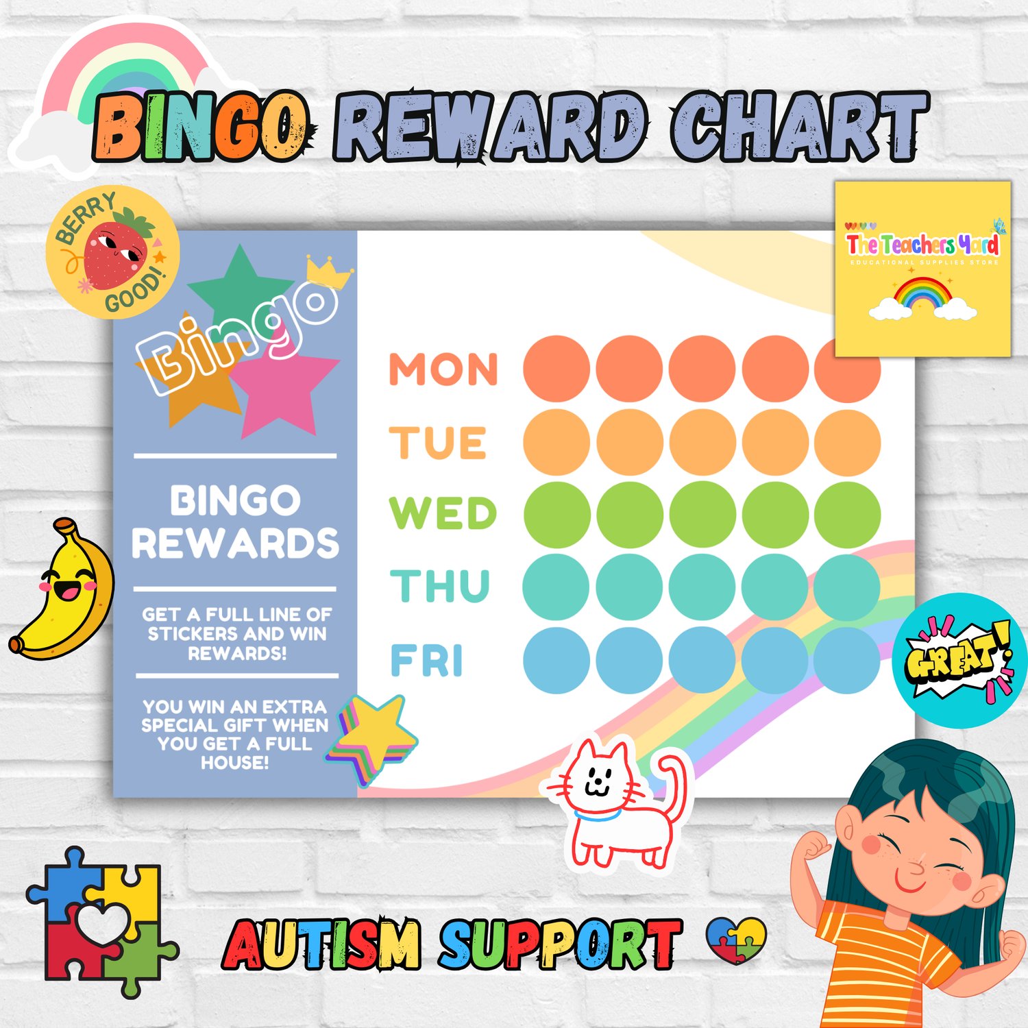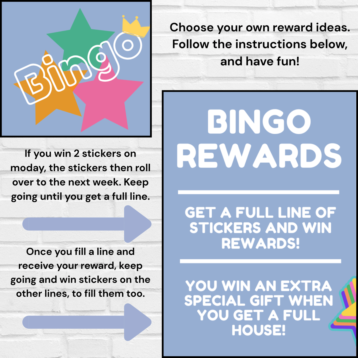Just like Bingo! Your child has the chance to win a full line, giving them a small reward. Then they keep going to get a full house, for a bigger reward or keep all the rewards small throughout. Again, this is your chart. You can choose many different ways to reward your child, just have fun with it!