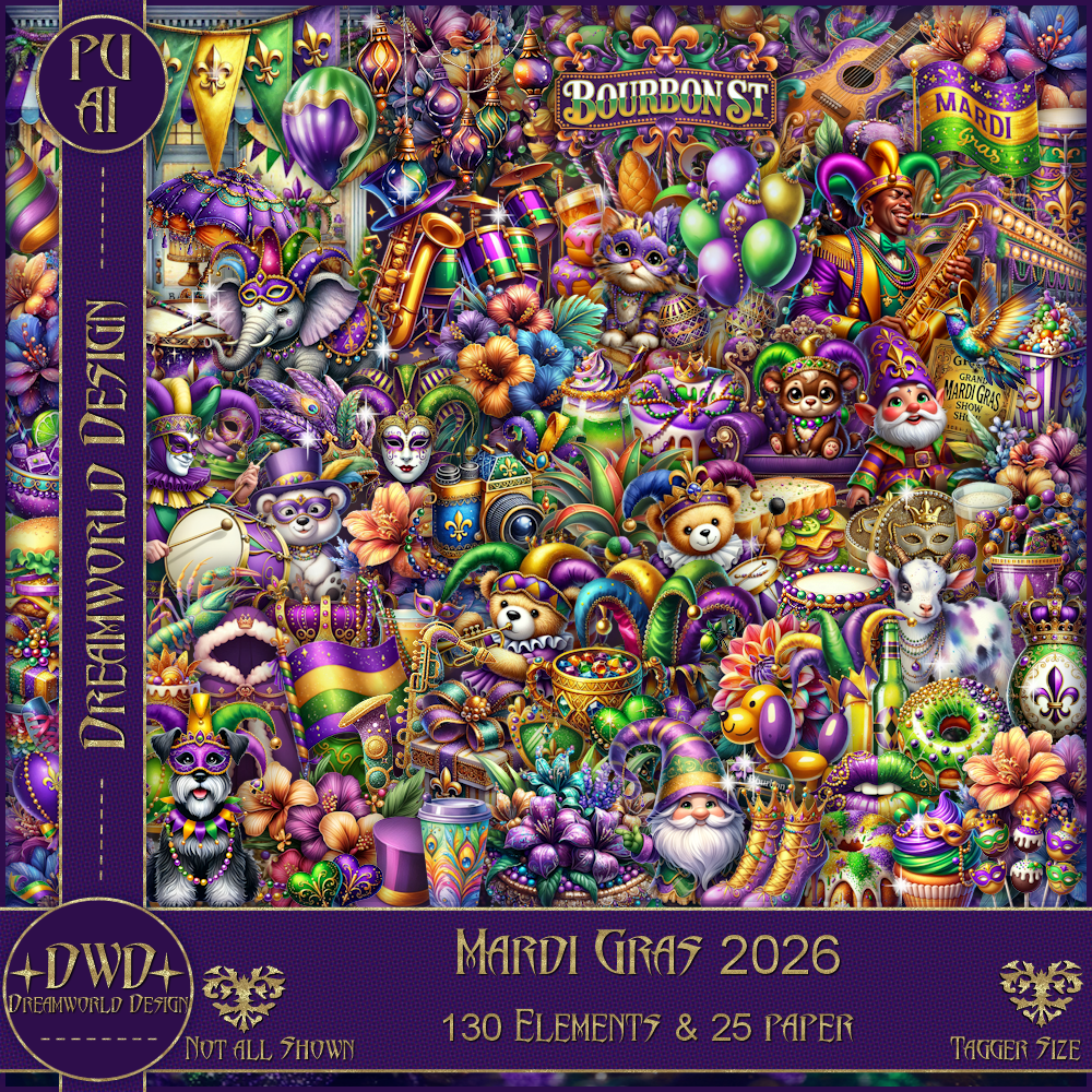 *Mardi Gras 2026* is a tagger-size kit with 130 elements & 25 papers.