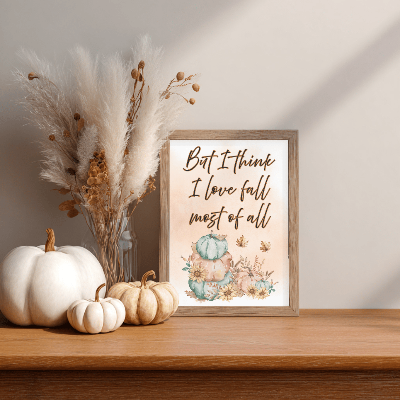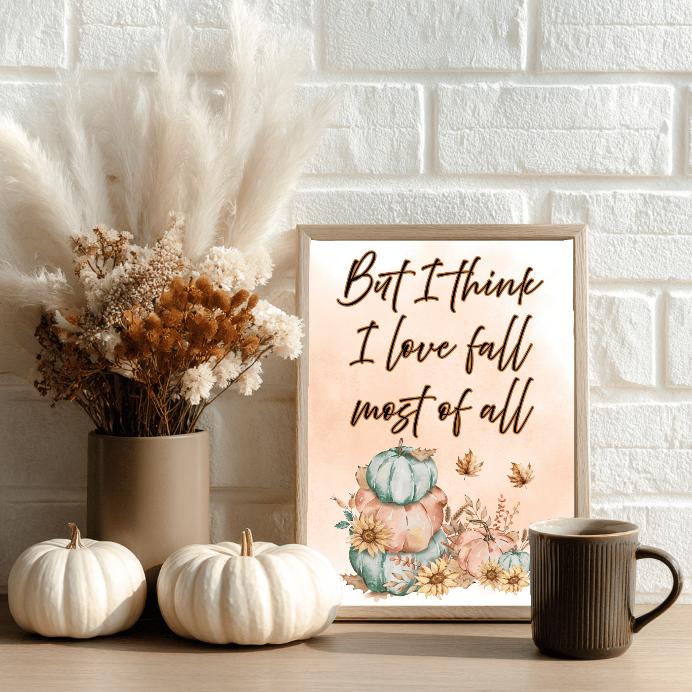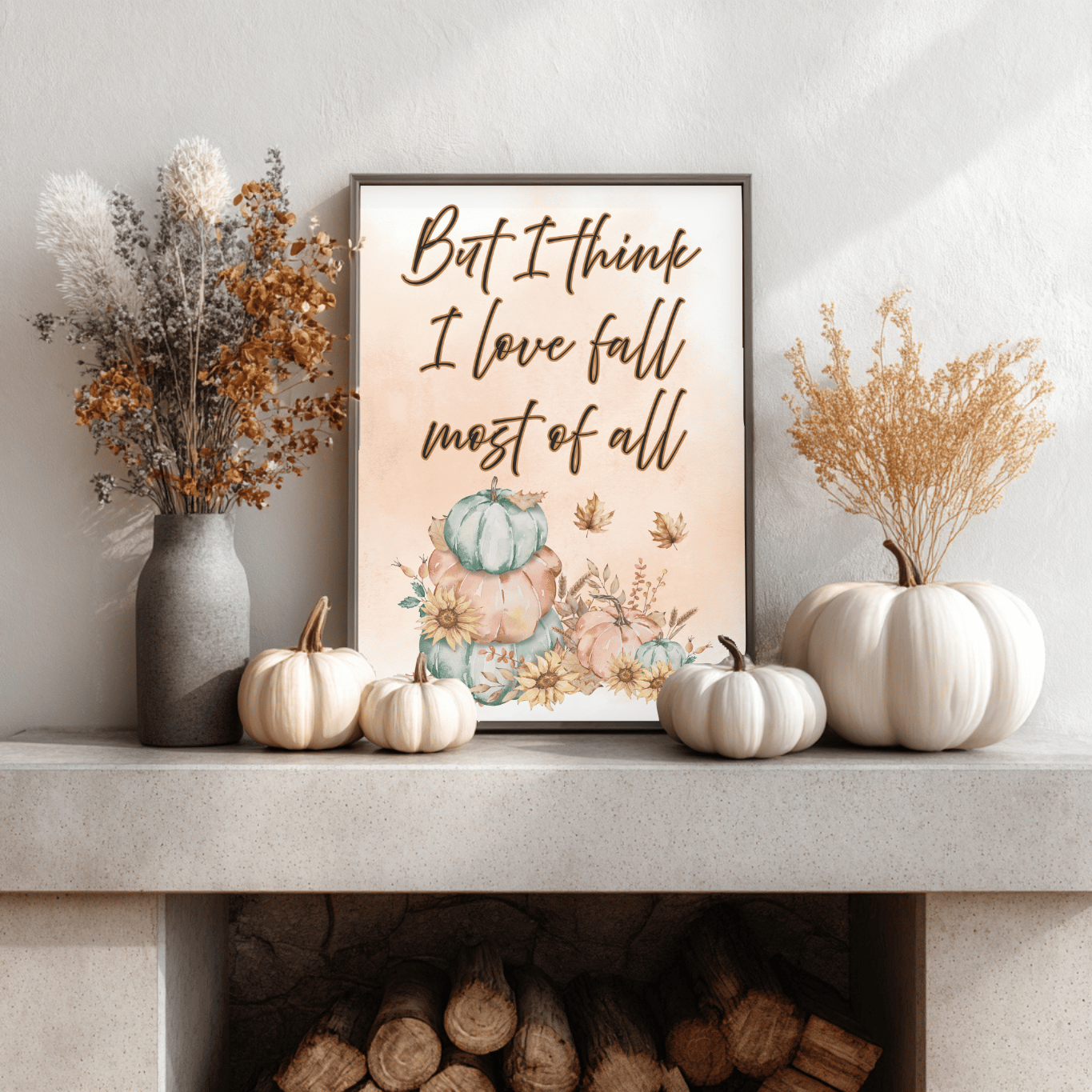 Bring the beauty of autumn into your home with this charming watercolor fall printable! Featuring a soft peach watercolor background, stacked pastel pumpkins, sunflowers, and the cozy quote “But I think I love fall most of all,” this art print adds warmth and rustic charm to any space.