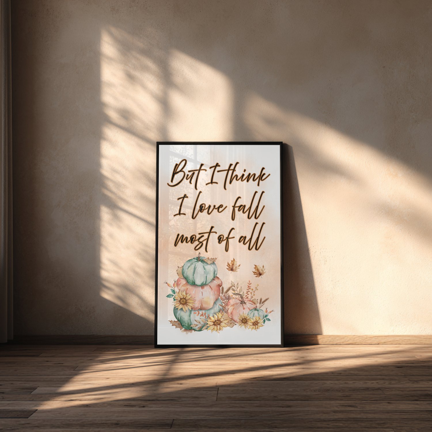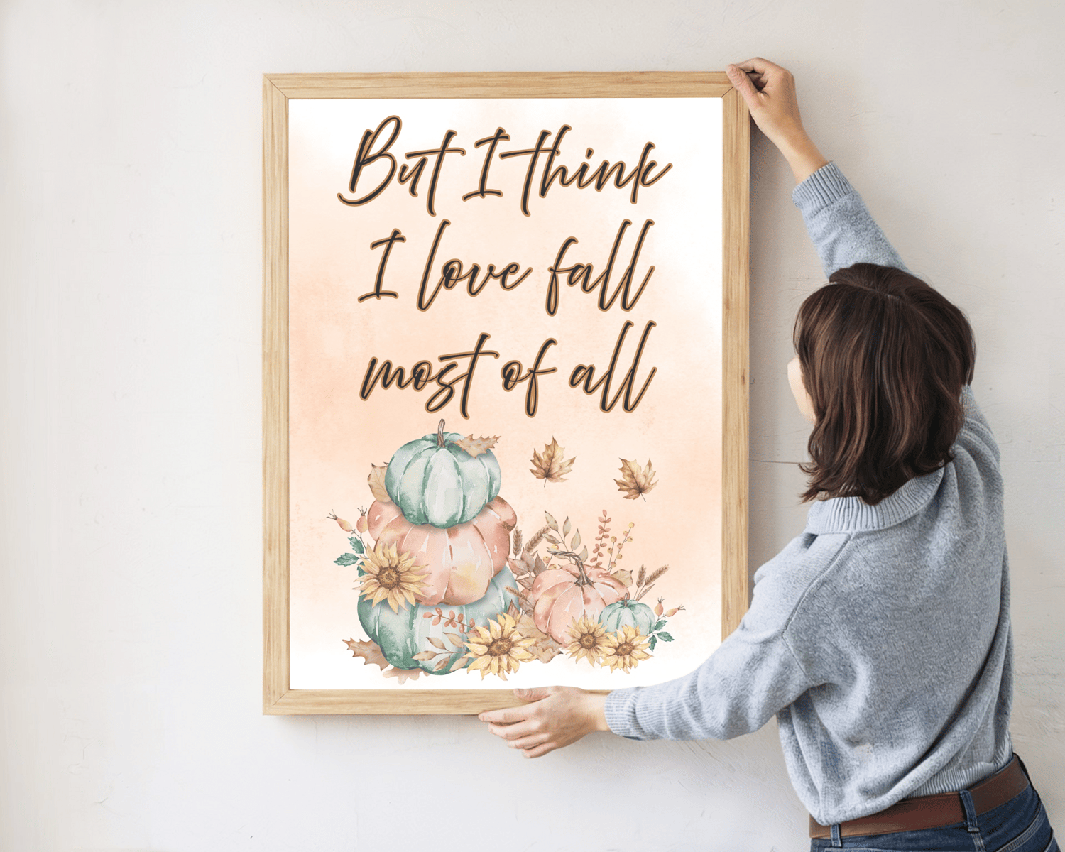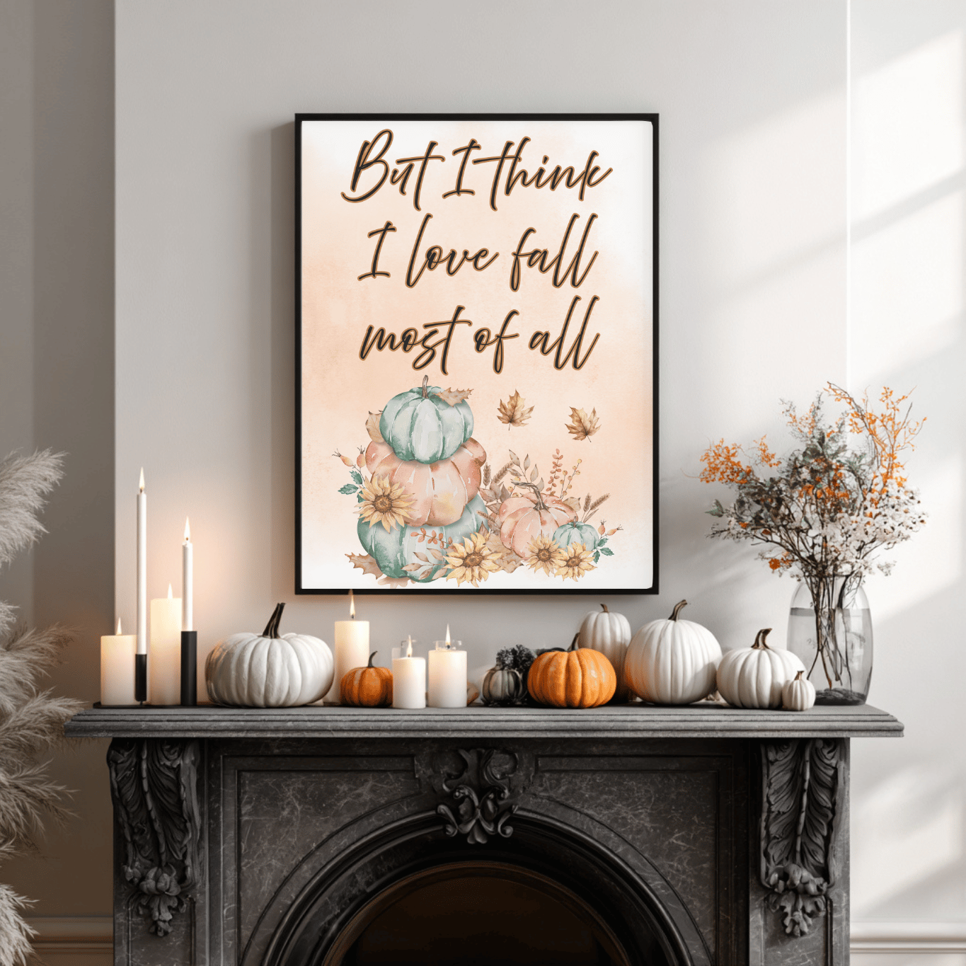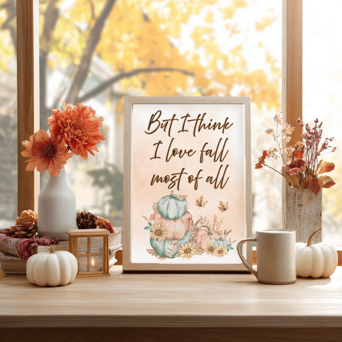 Bring the beauty of autumn into your home with this charming watercolor fall printable! Featuring a soft peach watercolor background, stacked pastel pumpkins, sunflowers, and the cozy quote “But I think I love fall most of all,” this art print adds warmth and rustic charm to any space.
