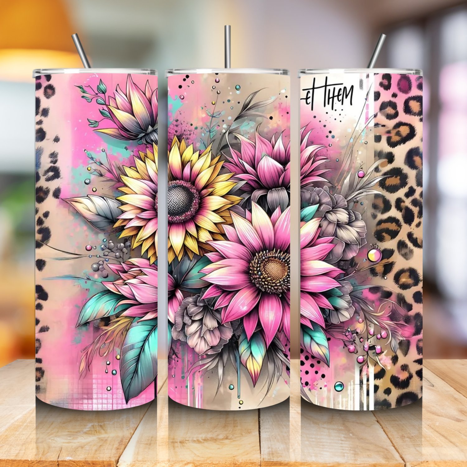 Make a bold statement with this stunning handmade tumbler featuring vibrant sunflower and floral artwork blended with trendy leopard print accents and soft watercolor splashes. The design combines bright pinks, golden yellows, and teal tones with artistic texture, giving this tumbler a modern boho boutique feels.