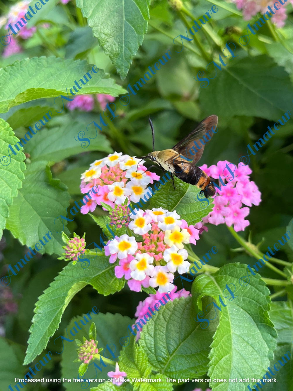 Amateur photograph of a Snowberry Clearwing Hummingbird Moth (Hemaris diffinis) feeding on lantana flowers. Image taken in Virginia, USA. Image pixels 3024x4032. Image easily resized as required for buyer needs. Purchase gives image without any watermark.
