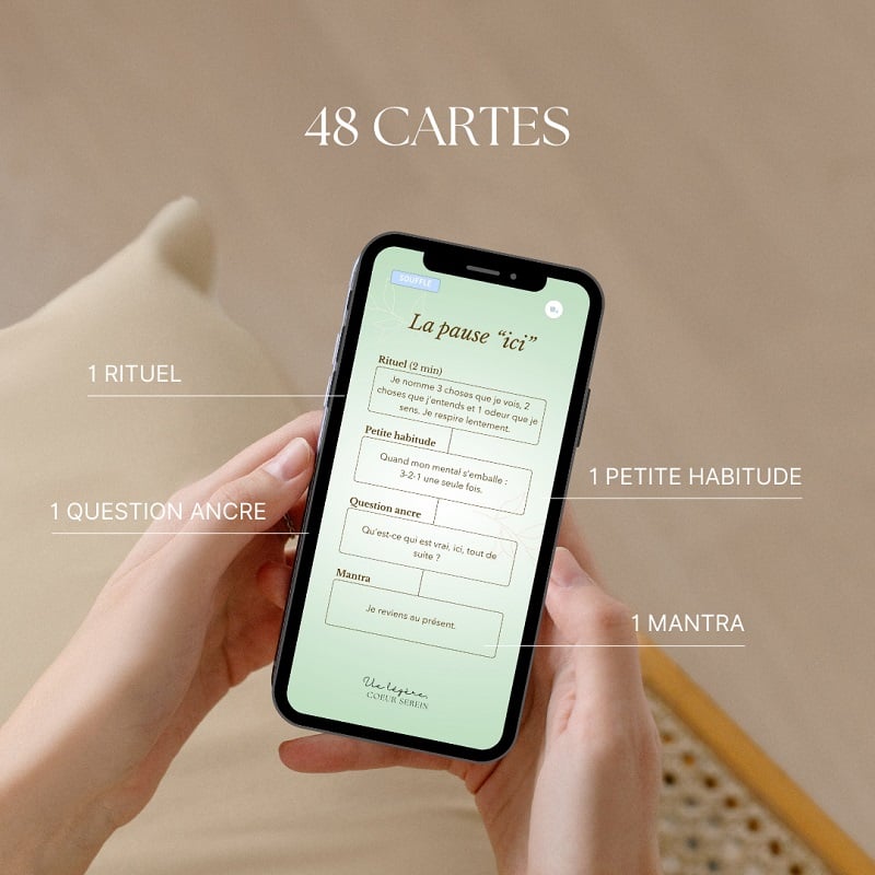 De petits rituels concrets, à faire défiler sur votre téléphone ou ordinateur pour alléger votre quotidien, vous recentrer et ralentir. À utiliser en 1 à 10 minutes, au rythme de votre journée. Choisissez une carte et laissez-vous guider.