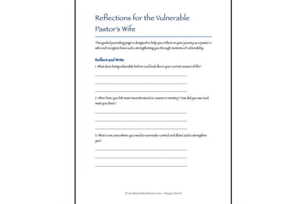 Being a pastor’s wife isn’t always easy—and sometimes it can feel lonely. This free downloadable journaling guide, Reflections for the Vulnerable Pastor’s Wife, was created to help you slow down, process your emotions, and let God speak strength into the quiet spaces of your heart.