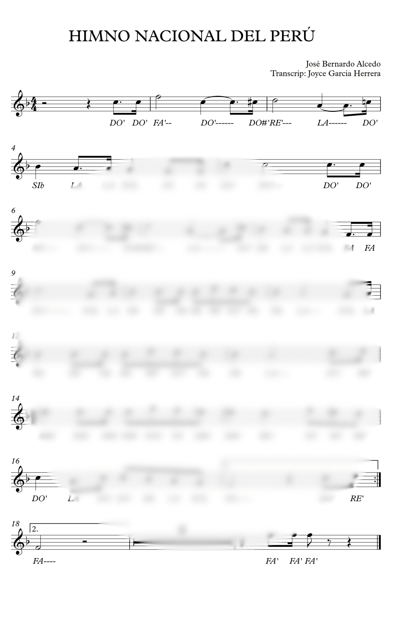 Partitura simplificada del himno nacional del Perú (fragmento principal CORO), adaptada especialmente para uso en clases escolares de música. Ideal para flauta dulce, teclado, xilófono, melódica, canto o pequeños ensambles en nivel inicial.