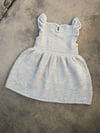 Den lysegrå Cara Flæsekjole er strikket i Pura Lana Ecologica fra Sesia i farven Corda/Polvere [0046] i str. 1-2 år.