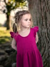 Den pink Cara Flæsekjole er strikket i Carpe Diem fra Lang Yarns i farven Fuchsia [165] i str. 4-6 år.