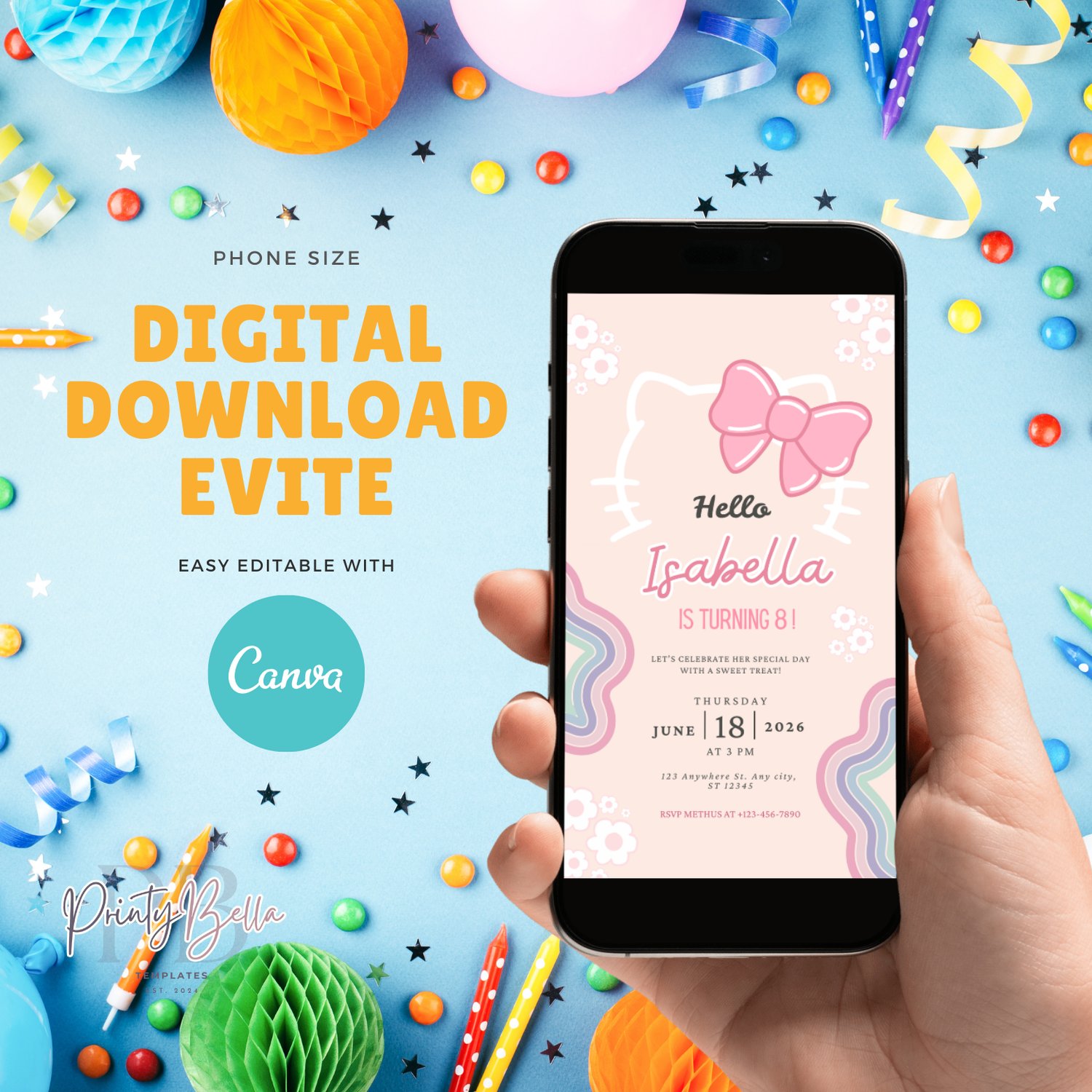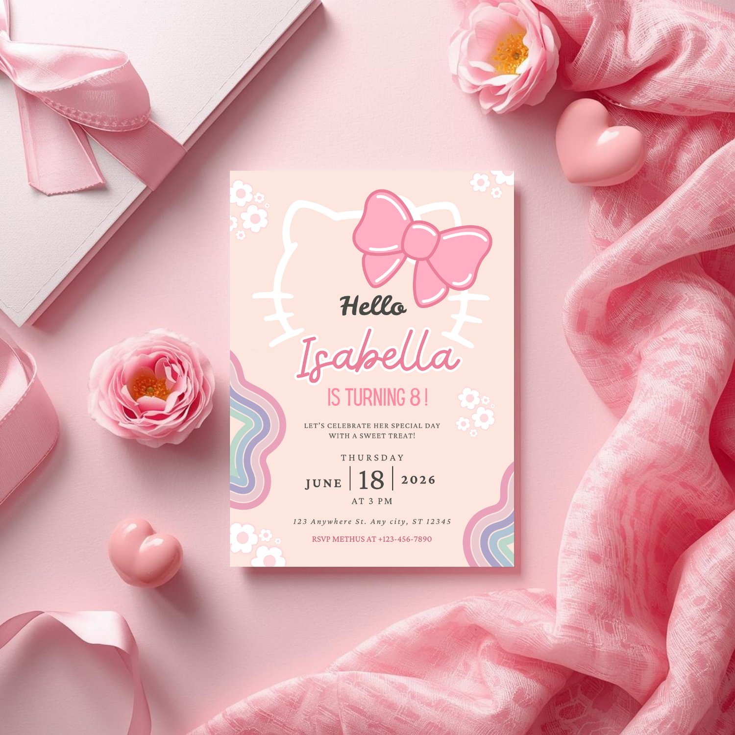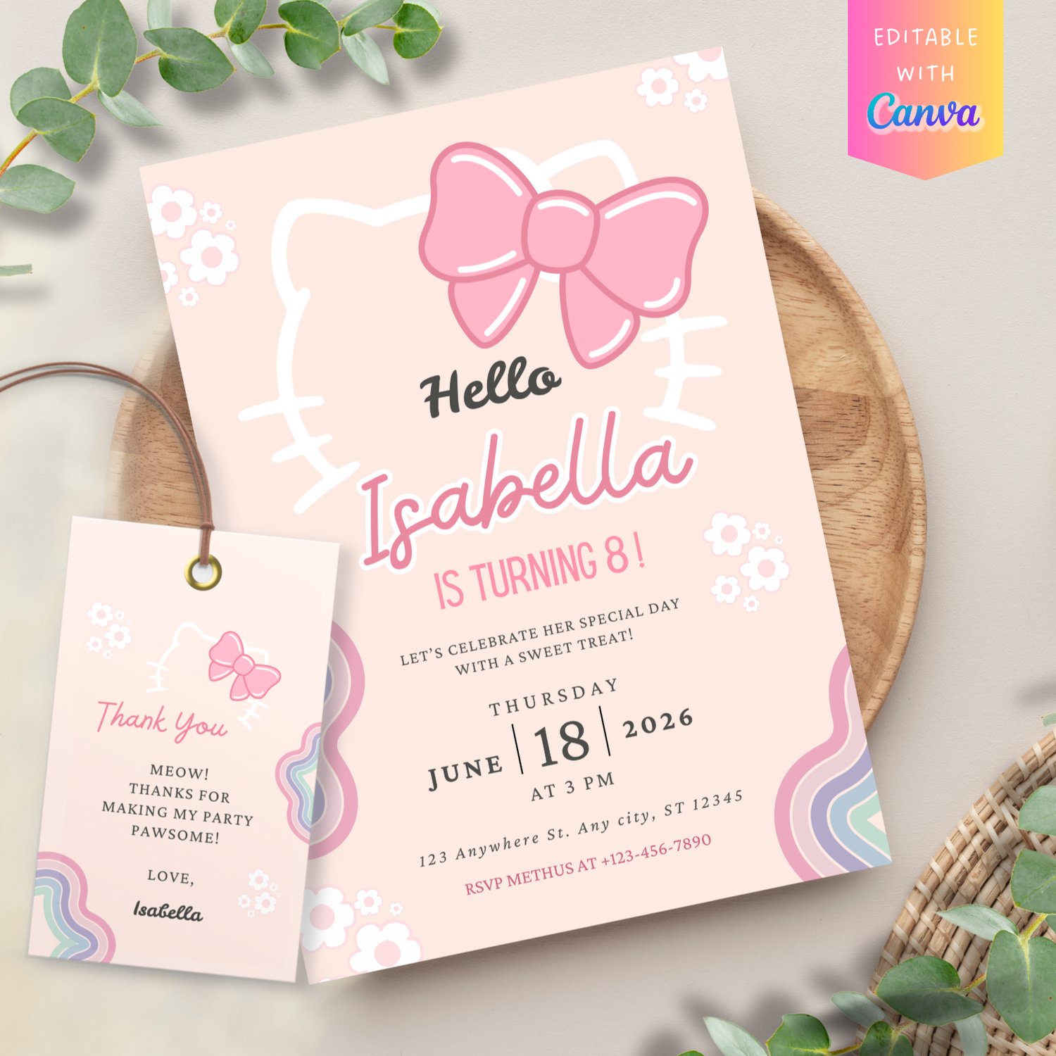Hello Kitty Birthday Invitation, Pink Party Theme, Cute Kitty Canva Editable Template (5x7, Evite) Digital Download