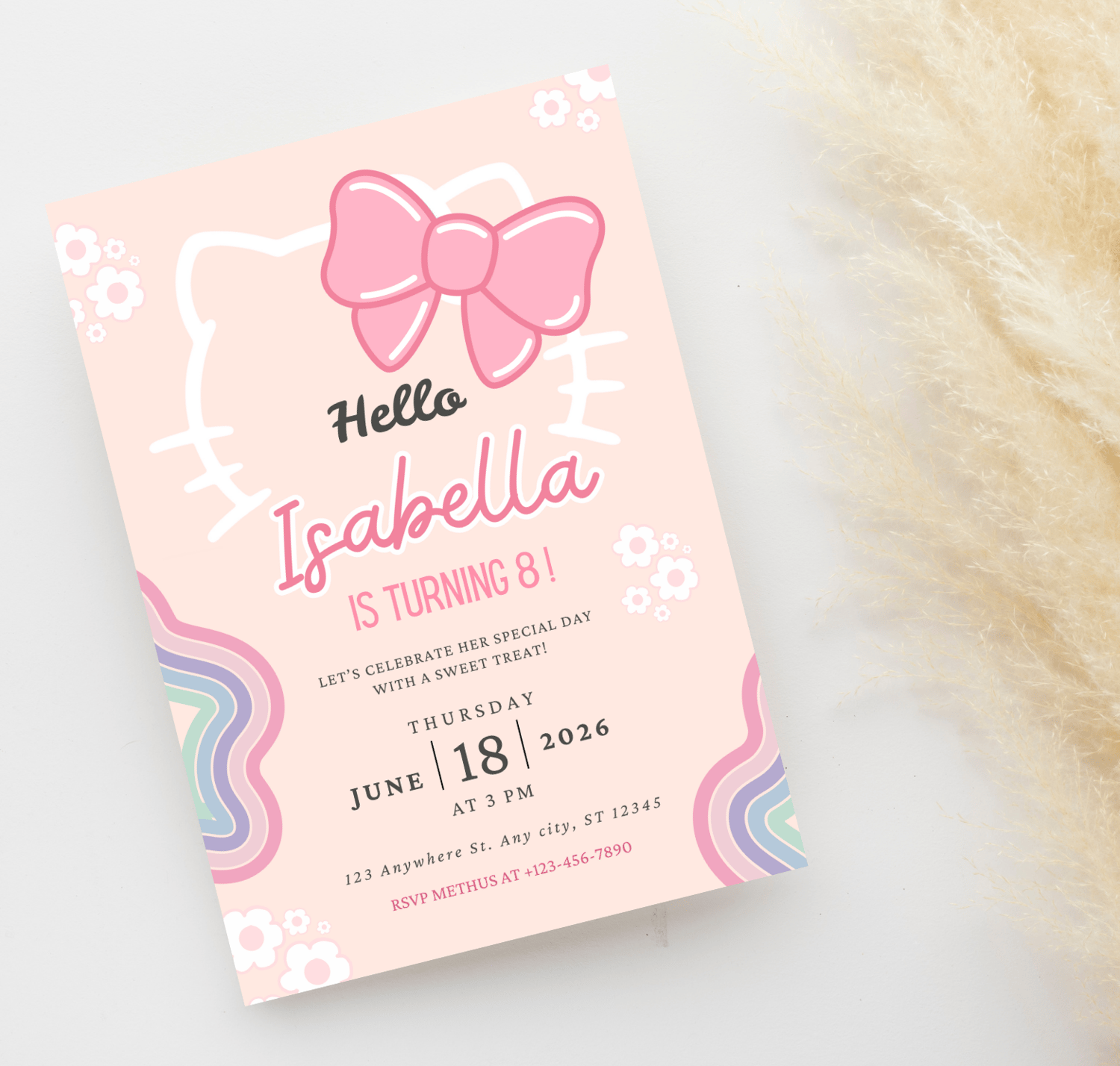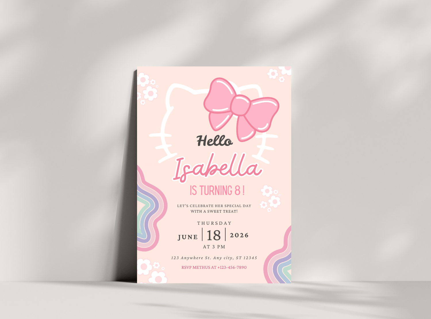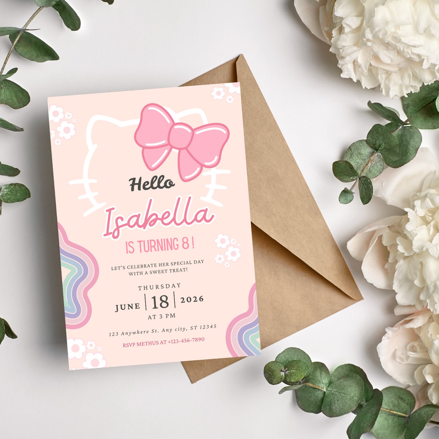 Hello Kitty Birthday Invitation, Pink Party Theme, Cute Kitty Canva Editable Template (5x7, Evite) Digital Download