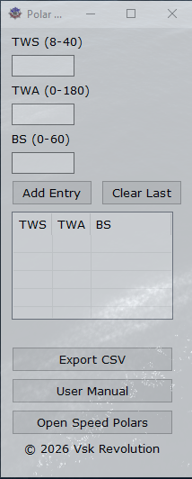 The Polar Data Recorder is a lightweight data logging tool for Virtual Skipper 5 players. It allows users to manually record sailing performance data (TWS, TWA, and BS) and export it in CSV format for analysis or use in the Speed Polars Web Apps on the Vsk Revolution website.