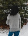 The model has an upper bust of 31” / 79 cm, a full bust of 34” / 86.5 cm, and upper arm circumference of 10.25” / 26 cm. The charcoal Nutiden sample was knit in a straight Size B without darts. The blue long sleeve Nutiden sample was knit with Size B hips, decreased to Size A bust/shoulder, with Size 1 darts, and Size B arm holes and sleeves. The light gray sample is Size A with Size 1 darts.