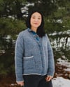 The base pattern is knit from the bottom up flat, then split for the front pieces and back while the V-neck shaping is worked at the same time. A drop shoulder construction is finished with a Three Needle Bind-Off, then the sleeves are picked up and worked flat for gauge consistency, then seamed at the very end. Finally, the neckband and any optional pockets are worked.