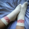 The Alps socks are quick to make and combine several interesting techniques: lace, slipped stitches, mosaic, wrapped stitches, colourwork. The socks are worked cuff down with a non-standard heel. This type of elegant heels was used in historical stockings belonging to Estonian museum collections.