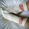 Size medium socks are shown in the photo. The yarns used for the sample: