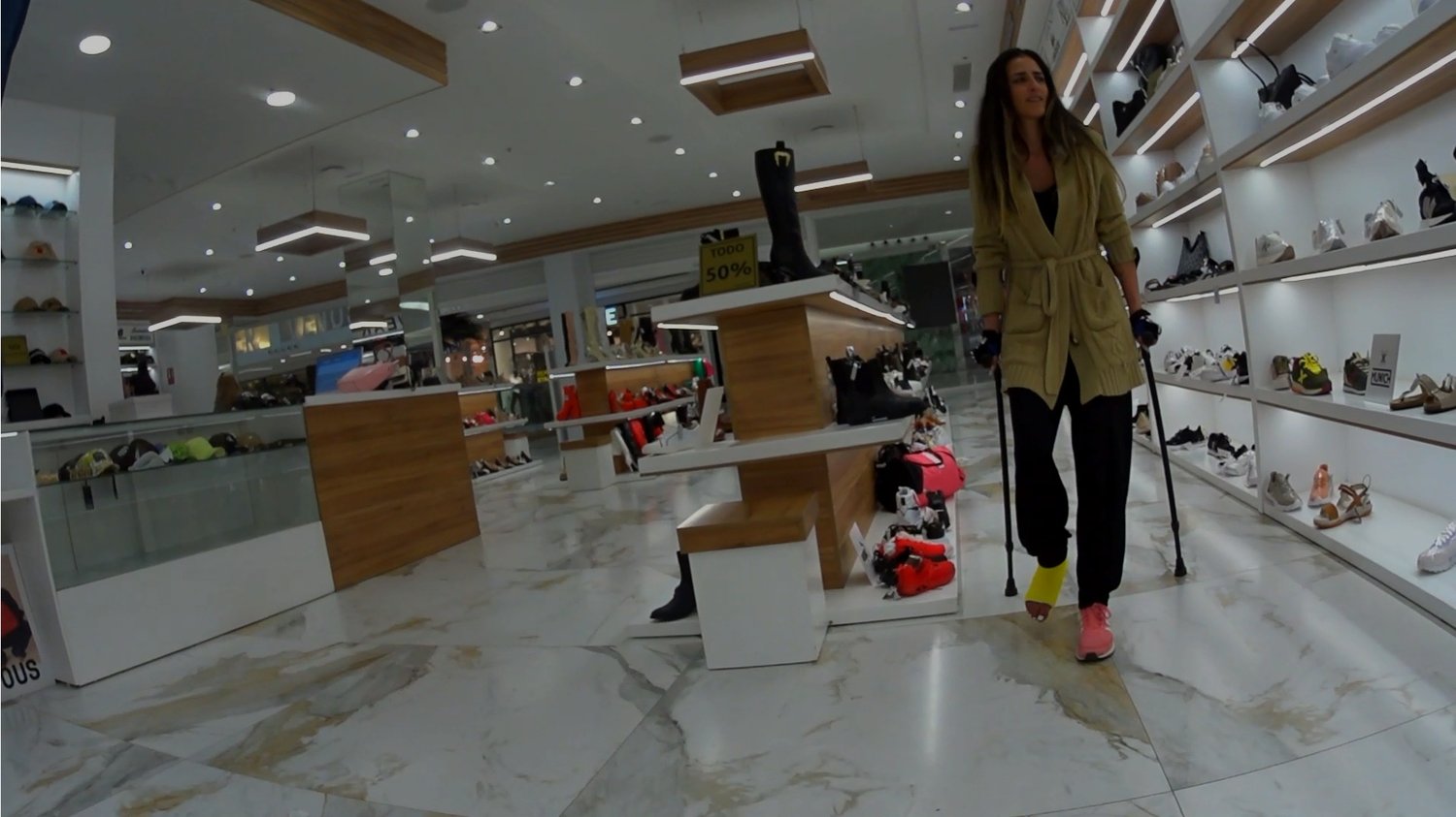 Watch Cat spend some time at the mall today, crutching carefully with her right foot casted in a yellow SLC. She is seen looking around inside a fancy shoe store, slowly clutching through the mall and then continues to crutch into another store, to look pretty much at everything. Her yellow casted foot is getting out full attention, some nice closeups were caught in there too as Cat slows down extra every now and then.