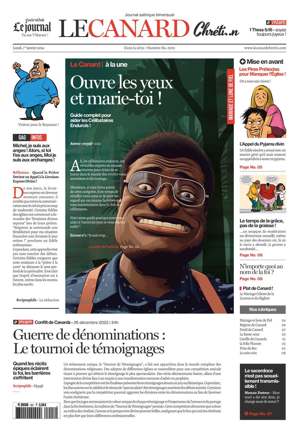 Nous avons le plaisir de vous annoncer la sortie de notre journal satirique, Le Canard Chrétien ! Plongez dans un univers d'humour intelligent, de réflexion et de satire, spécialement conçu pour apporter un regard critique et spirituel sur notre société.