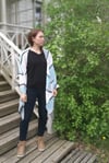 Dublin is a light weight shawl made from warm and cozy Alpaca wool. Light neutral colors are easy to attach with almost anything in your wardrobe. Yet, the black eyelet stripes are added to bring some modern attitude to this otherwise timeless shawl.