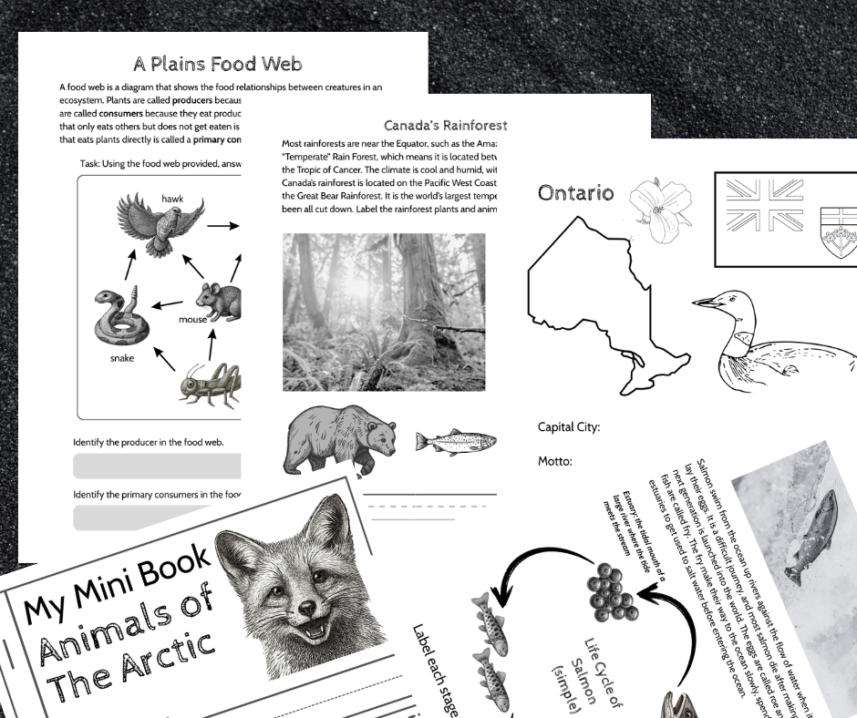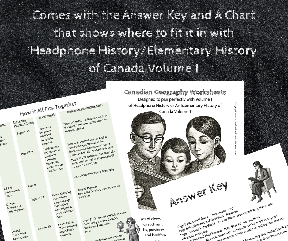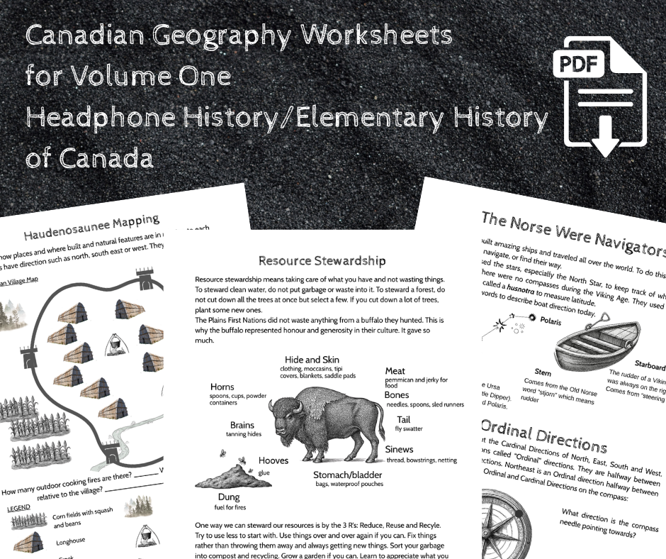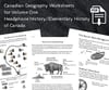 These cleverly coordinated Canadian Geography worksheets were created to pair with Headphone History Volume 1 and/or An Elementary History of Canada Volume 1 to round out your Social Studies curriculum. The download includes a chart that shows where to add the Geography worksheets as you follow the history curriculum. Most of the Geography concepts are contextualized into Canada's history for a seamless experience. Geographic concepts include, but are not limited to, globes and maps, mapping skills, cardinal and ordinal directions, earth's rotation and axis, hemispheres, oceans, continents, Canada in the world, ecosystems, food webs and chains, data collection and bar graphs, resource stewardship, community helpers, human and animal migration, glaciers, landforms and landform regions, exploration fact files, provinces and territories of Canada, bodies of water, ocean currents, the Great Lakes, and more!