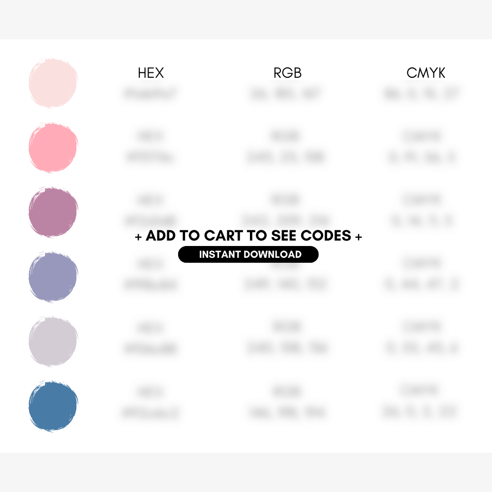 Elevate your brand's identity with our Peace Color Palette, featuring soothing hues of pale pink, soft pink, periwinkle, lavender rose, gray, and charcoal blue. This thoughtfully curated color scheme is ideal for small businesses and creatives looking to design cohesive branding elements such as logos, banners, and social media graphics. Perfect for use in Canva, our palette includes precise Hex Codes, RGB, and CMYK values for seamless integration across all your design projects. Enhance your website's aesthetic and create a harmonious visual presence with this versatile set of brand colors. Perfect for infusing a sense of peace and professionalism into your shop's branding strategy.