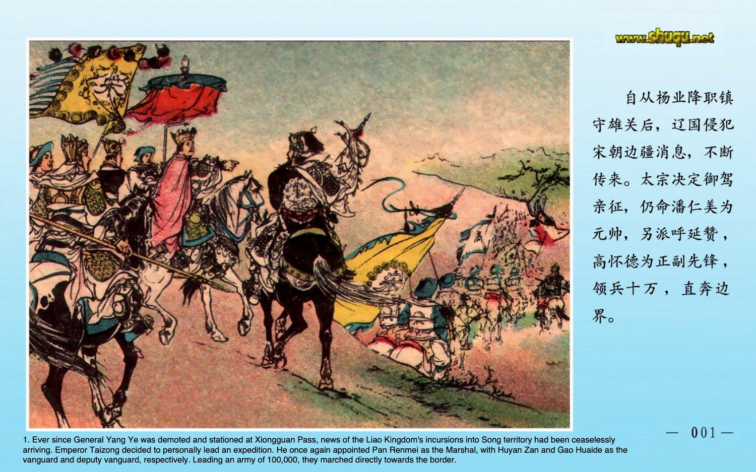 1. Ever since General Yang Ye was demoted and stationed at Xiongguan Pass, news of the Liao Kingdom's incursions into Song territory had been ceaselessly arriving. Emperor Taizong decided to personally lead an expedition. He once again appointed Pan Renmei as the Marshal, with Huyan Zan and Gao Huaide as the vanguard and deputy vanguard, respectively. Leading an army of 100,000, they marched directly towards the border.