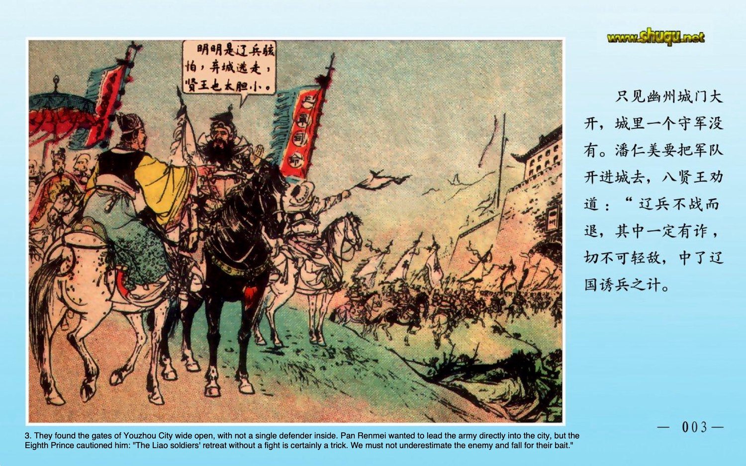 3. They found the gates of Youzhou City wide open, with not a single defender inside. Pan Renmei wanted to lead the army directly into the city, but the Eighth Prince cautioned him: "The Liao soldiers' retreat without a fight is certainly a trick. We must not underestimate the enemy and fall for their bait."