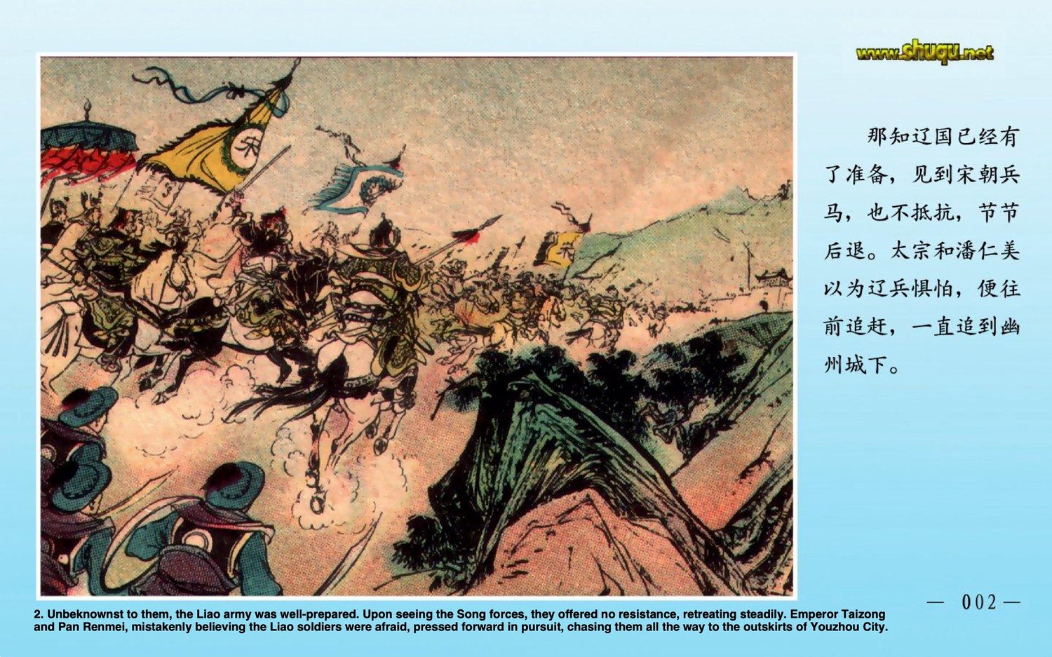 2. Unbeknownst to them, the Liao army was well-prepared. Upon seeing the Song forces, they offered no resistance, retreating steadily. Emperor Taizong and Pan Renmei, mistakenly believing the Liao soldiers were afraid, pressed forward in pursuit, chasing them all the way to the outskirts of Youzhou City.
