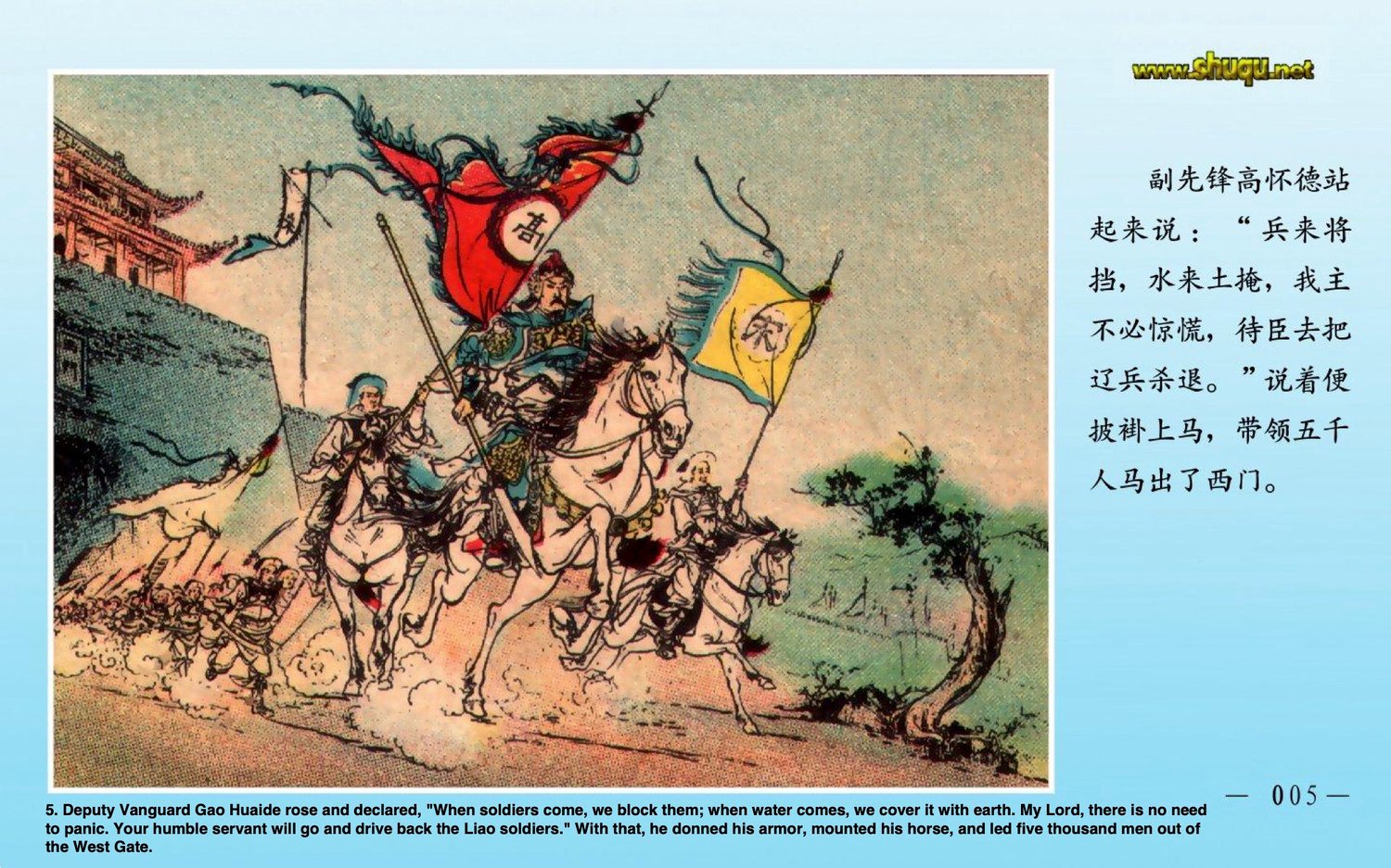 5. Deputy Vanguard Gao Huaide rose and declared, "When soldiers come, we block them; when water comes, we cover it with earth. My Lord, there is no need to panic. Your humble servant will go and drive back the Liao soldiers." With that, he donned his armor, mounted his horse, and led five thousand men out of the West Gate.