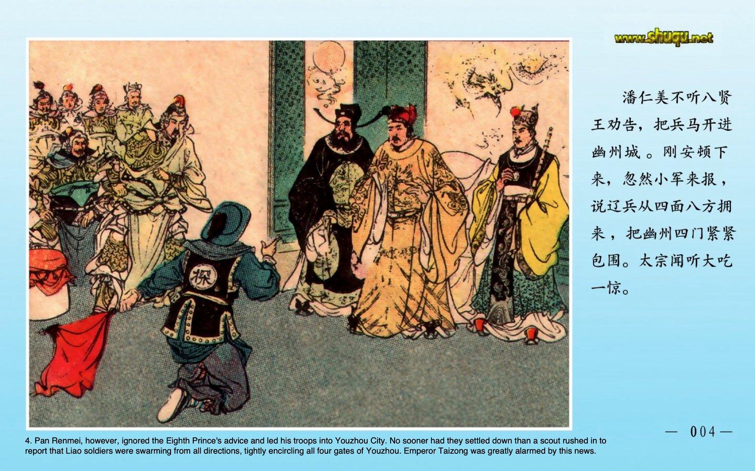 4. Pan Renmei, however, ignored the Eighth Prince's advice and led his troops into Youzhou City. No sooner had they settled down than a scout rushed in to report that Liao soldiers were swarming from all directions, tightly encircling all four gates of Youzhou. Emperor Taizong was greatly alarmed by this news.
