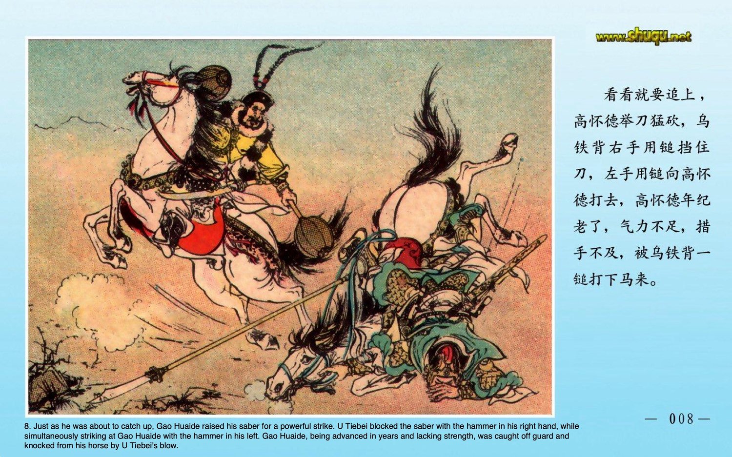 8. Just as he was about to catch up, Gao Huaide raised his saber for a powerful strike. U Tiebei blocked the saber with the hammer in his right hand, while simultaneously striking at Gao Huaide with the hammer in his left. Gao Huaide, being advanced in years and lacking strength, was caught off guard and knocked from his horse by U Tiebei's blow.