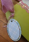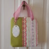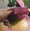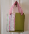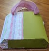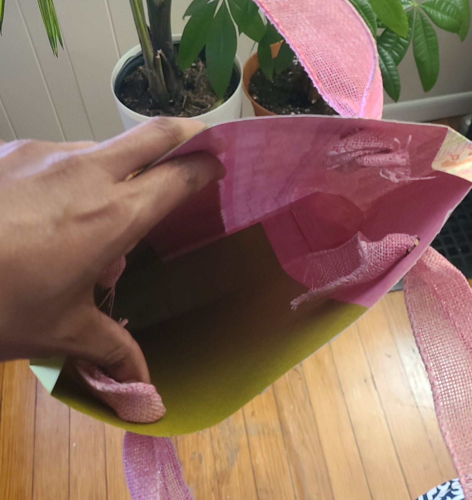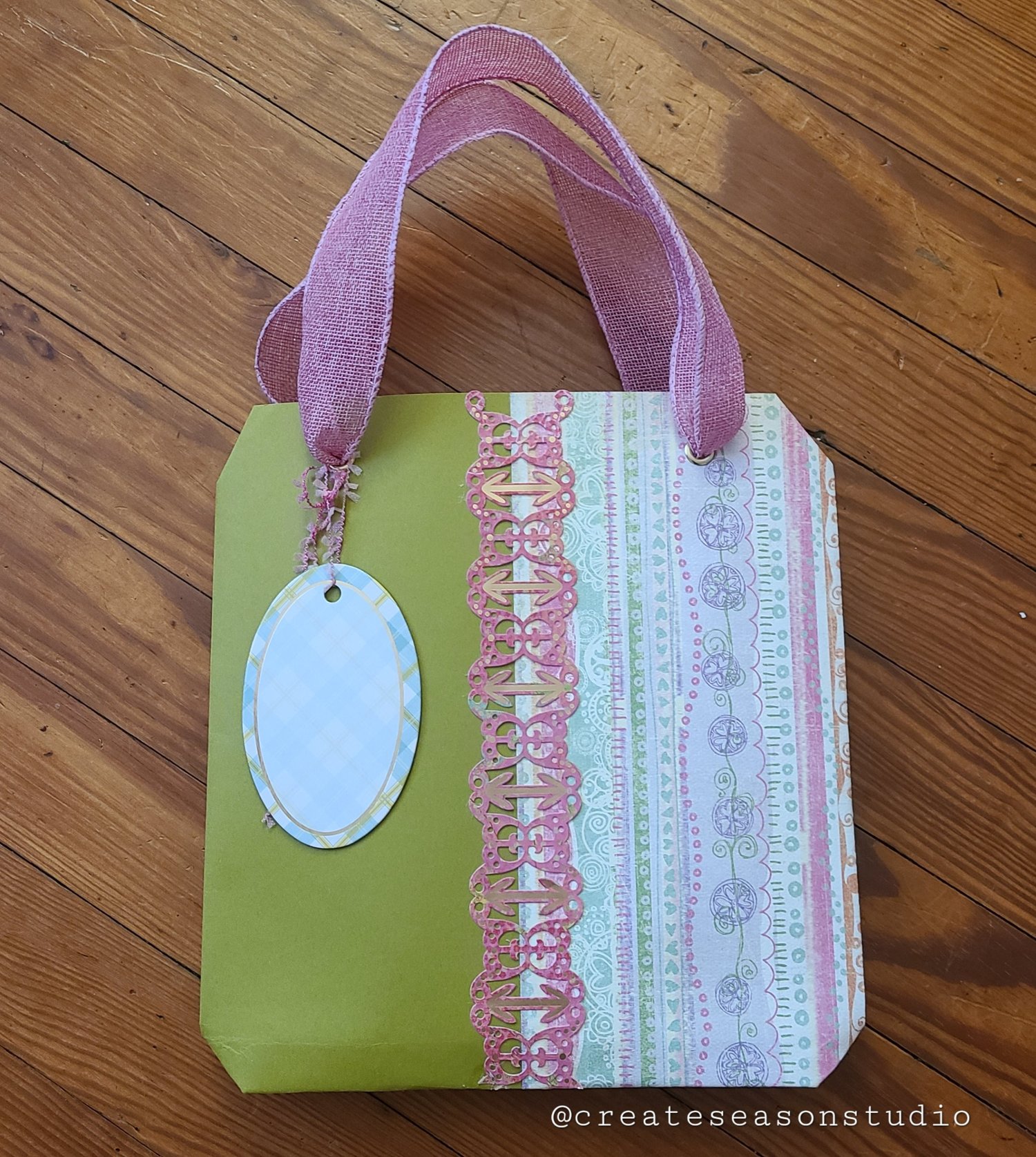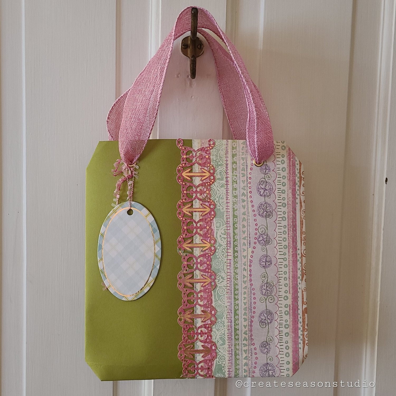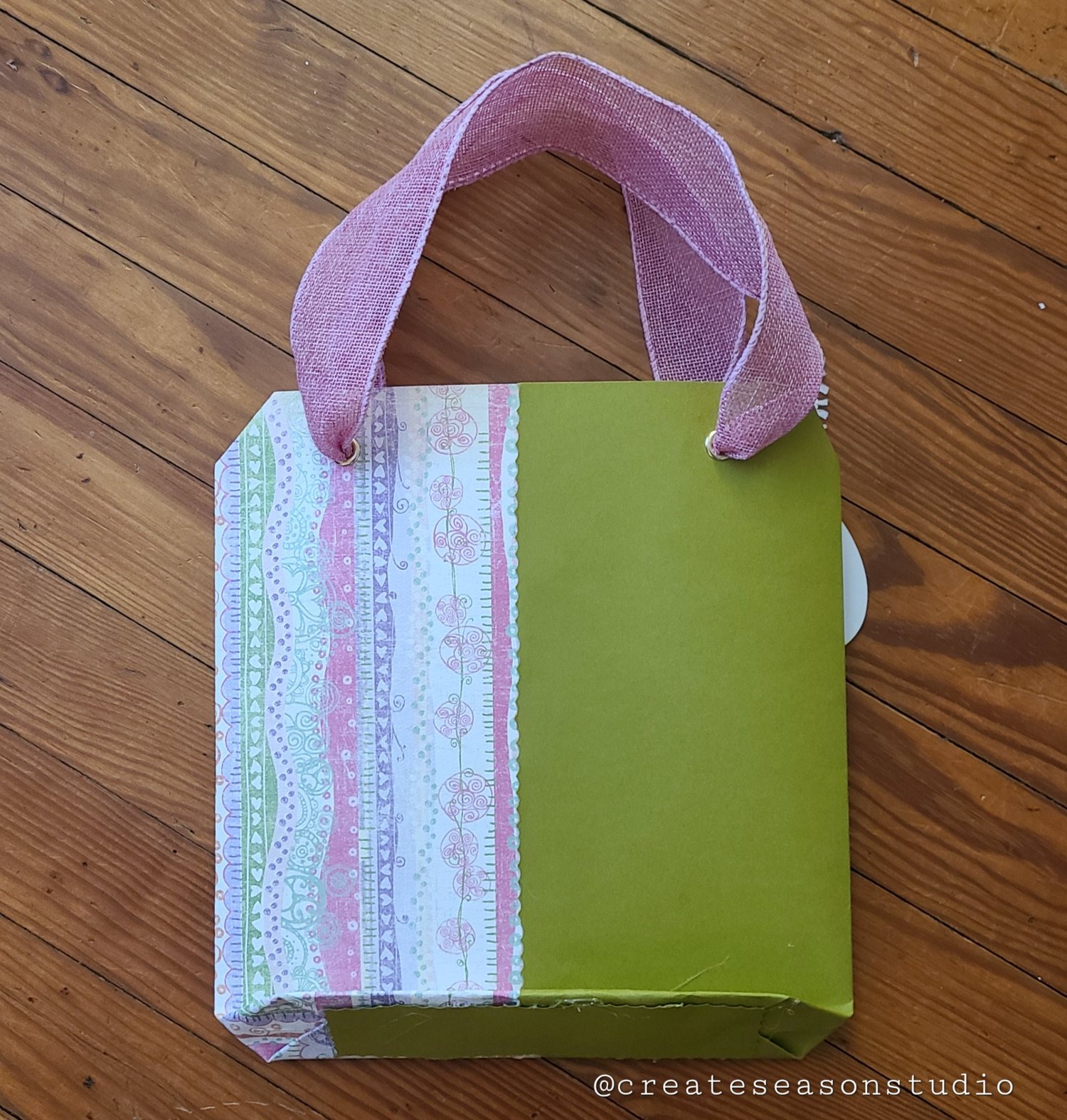 Keep your books, supplies, or gifts organized in style with this handmade small envelope-style tote. Crafted from a coordinated trio of high-quality scrapbooking cardstock, this tote features a harmonious palette of pink and light green, purple and light pastel teal with decorative scrapbook trims and borders for a charming, princess-inspired touch. A matching ribbon seam and floral decorative elements complete the look. The sturdy ribbon handles are adjustable and reinforced with metal eyelets for added durability and secure handling.