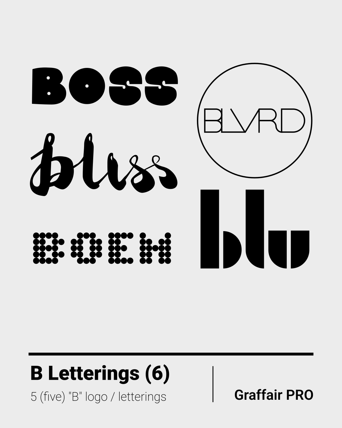 B Letterings (6): The sixth set of "B" logo/letterings with 5 (five) designs. These letterings are included amongst 800 ones in the "800 SVG Letterings" bundle edition.
