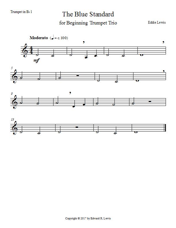 Blue Standard is a very simple blues song. It is easy enough for beginners to play. The highest note is second space A and the smallest rhythmic value is quarter-notes. The piece also gives each trumpet player enough rests so they can play all the way through even if they don’t have very strong embouchures yet.