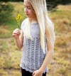 Notes: Moonlit is a simple tank worked from the bottom up, in the round with a fun lace texture on the bottom section. The body is then split and the front and back are worked separately and then joined at the shoulders with a three needle bind off.