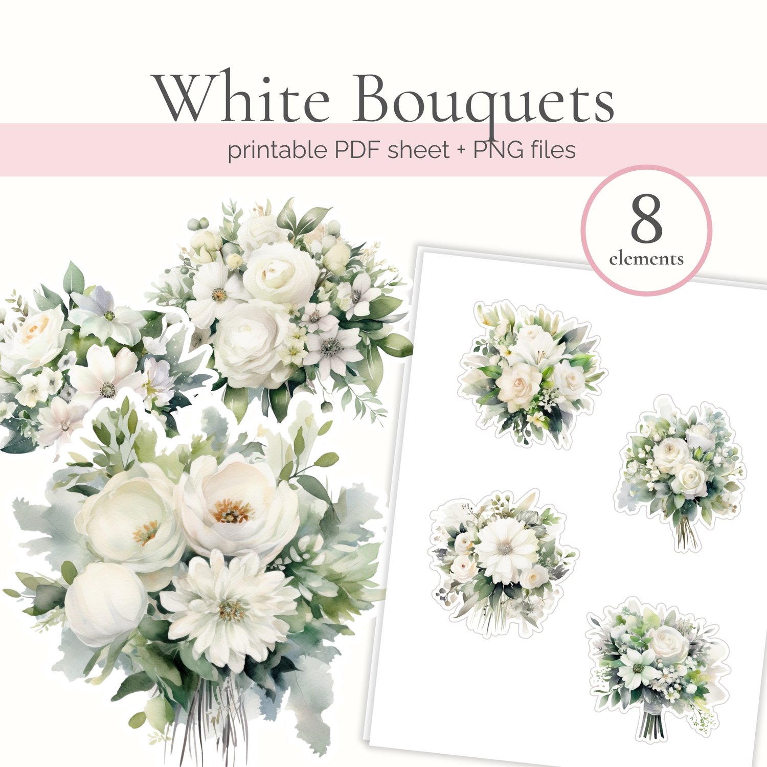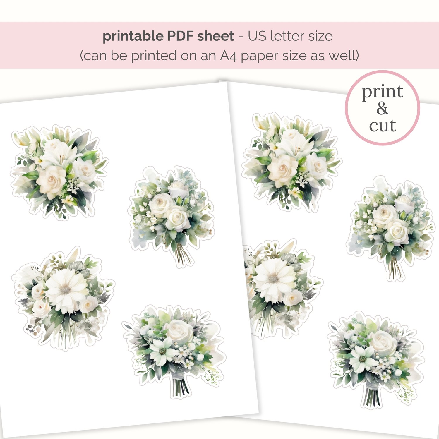 Free watercolor floral clipart & card making printables featuring elegant white wedding bouquets. This set works beautifully for both digital designs and handmade paper crafts. Whether you’re creating wedding cards, bridal stationery, or simply love working with white flowers and floral clipart, this free set is easy to use and beginner-friendly.