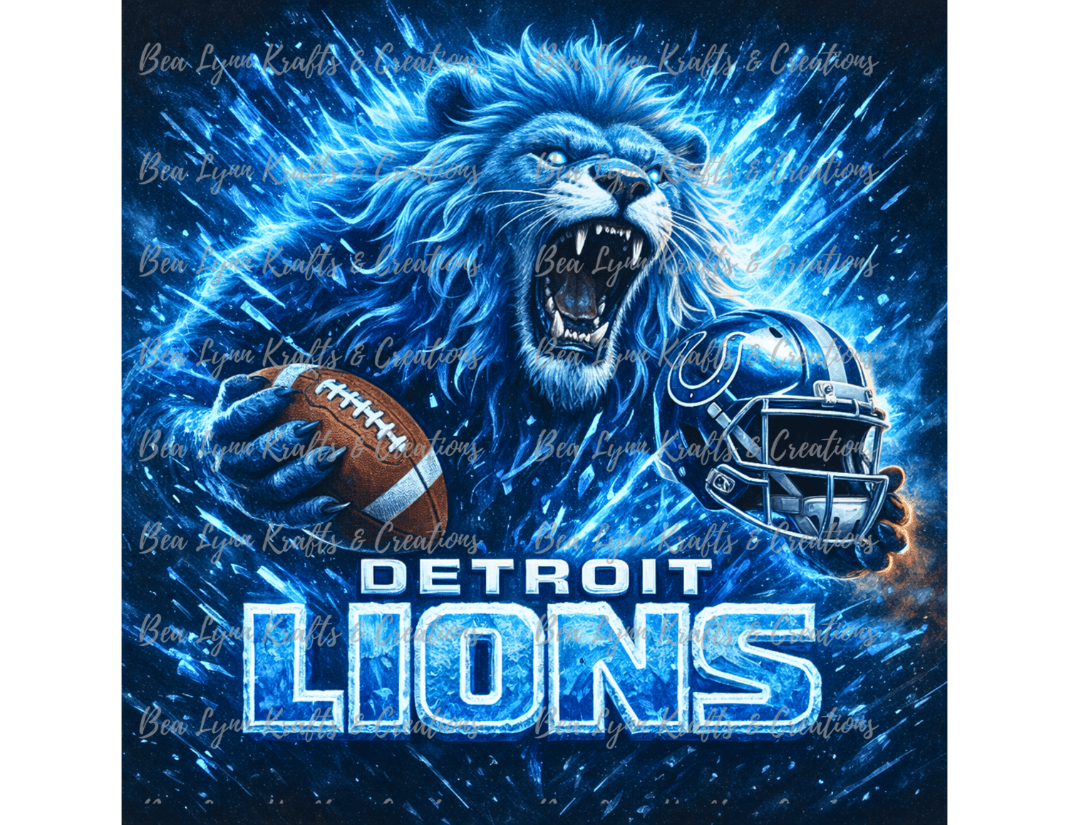 The design has a bold 3D illustrated look, packed with texture, energy, and high-impact lighting—perfect for sports fans, tailgate apparel, and Detroit Lions–themed craft projects. The large, icy “Detroit Lions” text completes the design, giving it a powerful, professional sports aesthetic ideal for sellers looking for bestselling football sublimation graphics.